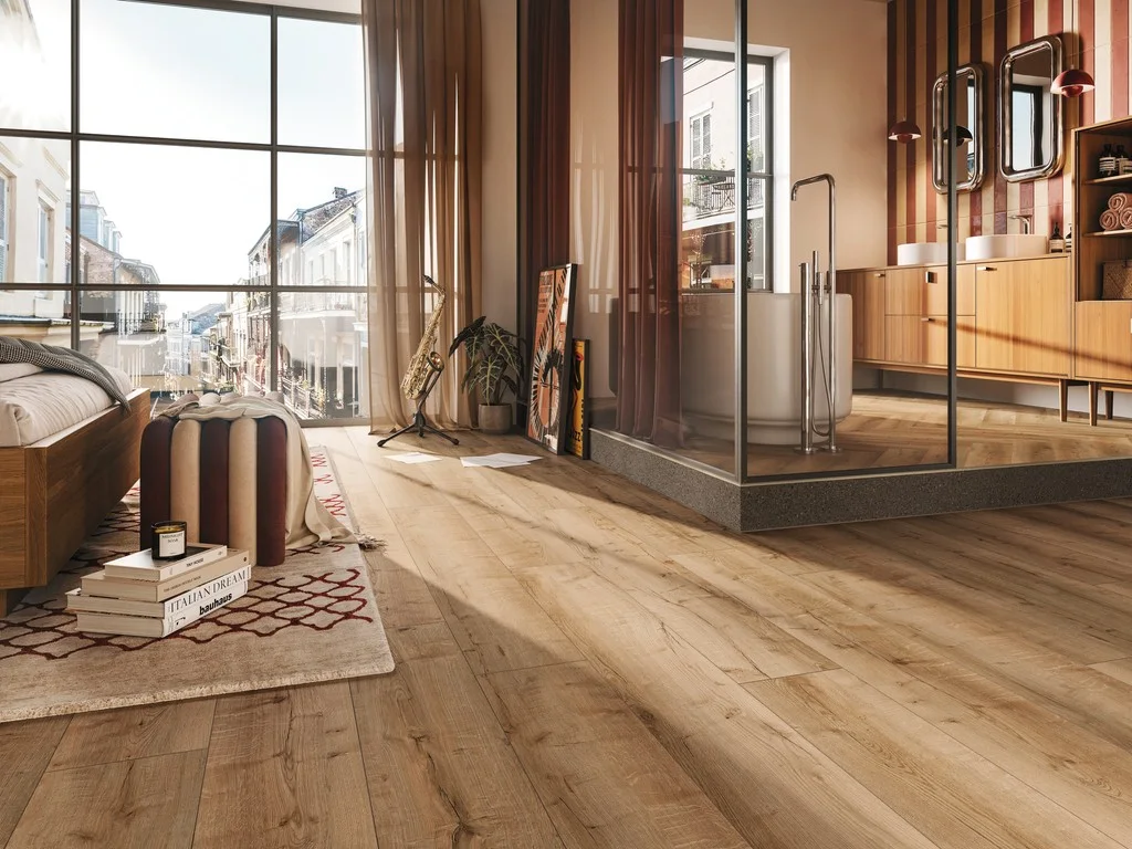 Das Dekor mit typischer Eichenholzmaserung charakterisiert perfekt den Stil der rustikalen Moderne. Das Fischgrätdesign wirkt luxuriös und schafft eine außergewöhnliche Atmosphäre. Die an vier Seiten umlaufende Fase strukturiert das Verlegebild und verleiht ihm ein gleichmäßiges Muster.