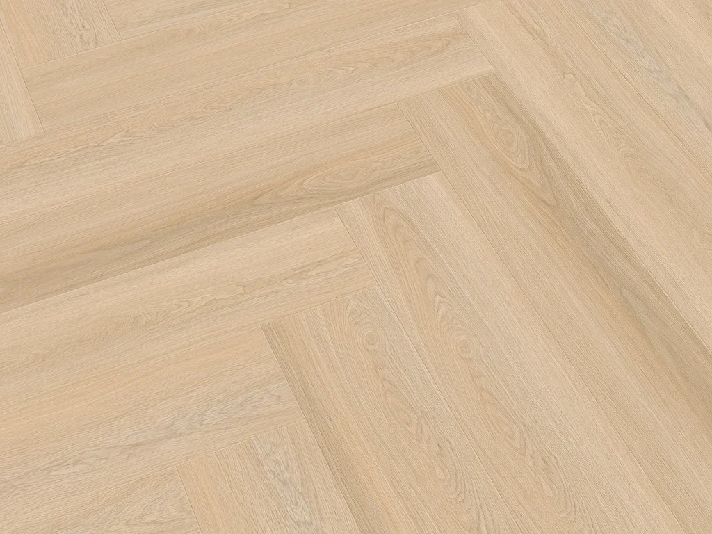 Die markante Eichenholzmaserung des Dekors vermittelt Behaglichkeit und natürliche Lebendigkeit. Das Fischgrätdesign dieses Bodens verleiht deinem Zuhause ein ganz besonderes Flair: einen Hauch von Luxus. Die 4-seitig umlaufende V-Fuge betont den Dielencharakter.