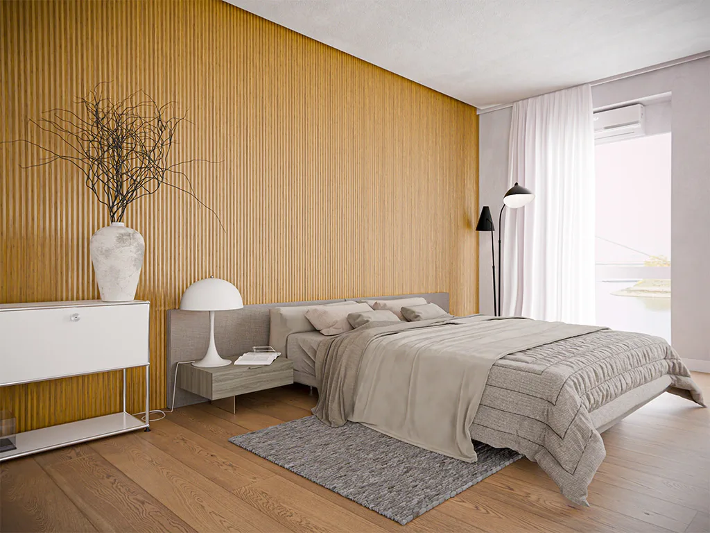 Die Bambus-Wandpaneele werden auf eine Sperrholzunterkonstruktion montiert, indem man sie Nut-auf-Feder zusammensteckt und anschließend unsichtbar mit kopflosen Stiftnägeln im 40–50°-Winkel durch Nut oder Feder ins Sperrholz schießt. Du kannst die Paneele sowohl vertikal als auch horizontal anbringen.
