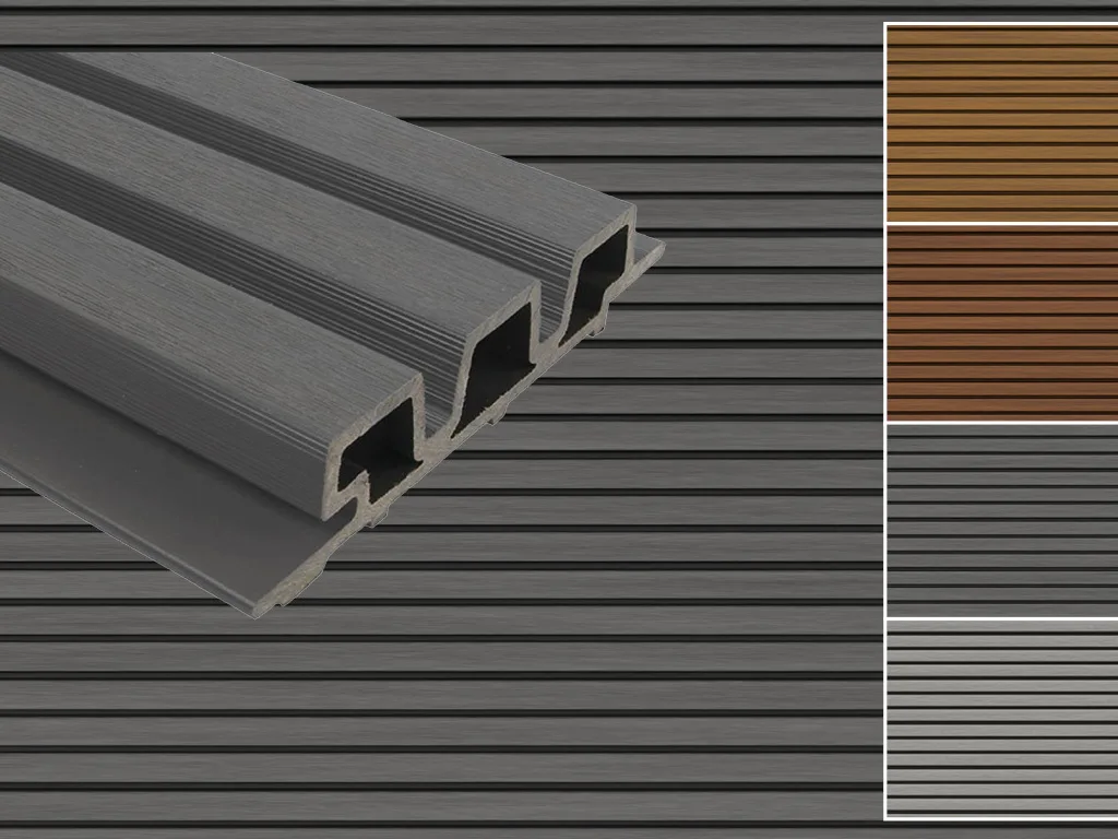 Optisch wirkt die Fassadenverkleidung wie feine, einzelne Rhombusprofile. Jedoch handelt es sich um eine geschlossen Verkleidung mit Nut + Federprofilen. Ein einzigartiges Aussehen, das angenehm zu berührendes Material und intensive, zufällig kombinierte holzähnliche Farben verbindet. Unauffällige Befestigung mit Schraubköpfen in Profilfarbe.