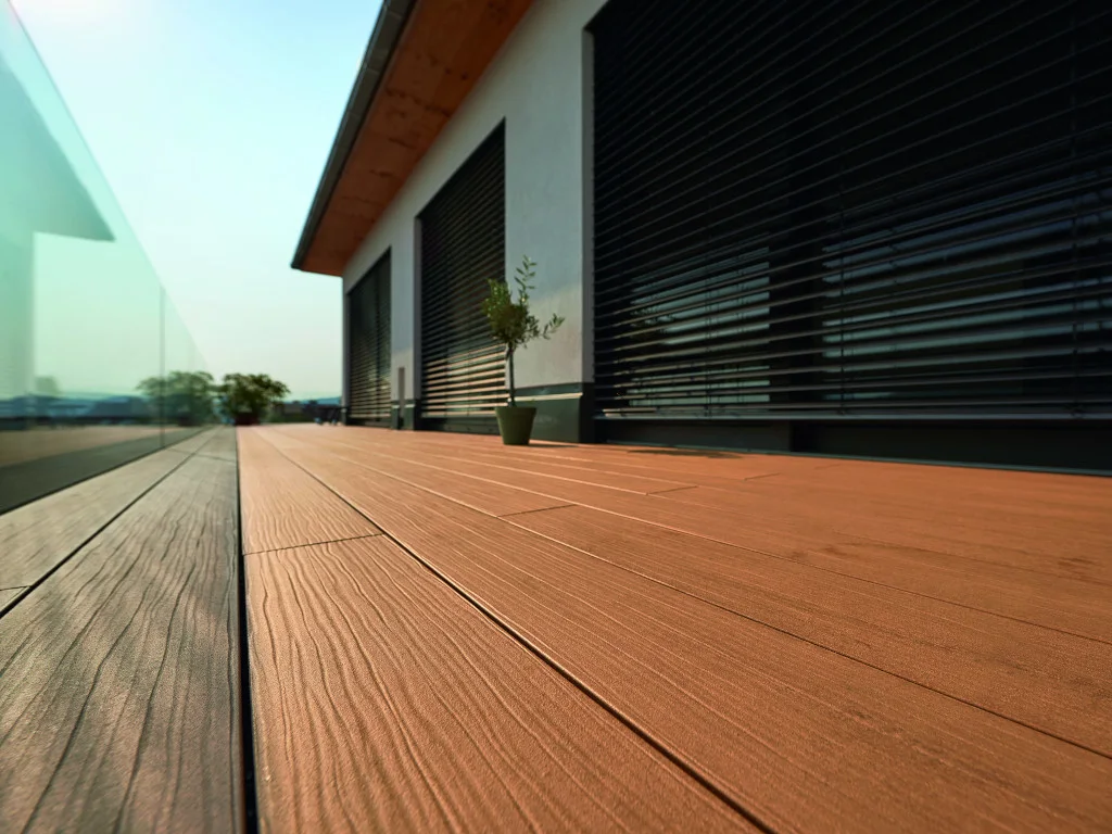 Diese 21 mm starke Terrassendielen werden aus WPC hergestellt.