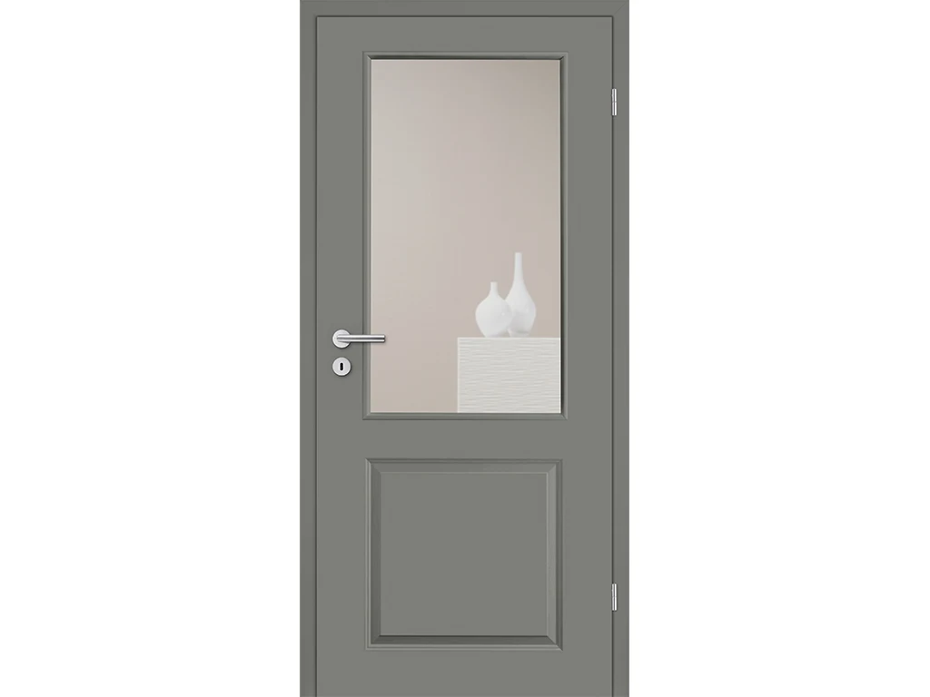 Die Graulacktür der Serie Elegance besticht durch ihre dauerhafte und strapazierfähige Oberfläche aus wasserbasiertem Graulack. Das Türblatt präsentiert sich – passend zum Namen der Serie – in einer edlen Optik und beeindruckt mit dezenten Reliefs und Prägungen, deren feine Linien eine besondere Eleganz und Unaufdringlichkeit ausstrahlen. Eine hochwertige Spritzlackierung sorgt für ein robustes, homogenes und angenehm glattes Erscheinungsbild des Türblatts. Für zusätzlichen Komfort und Sicherheit wird ein Buntbartschloss mitgeliefert. Dank der zweiteiligen Türbänder V0020 WF sind Tür und Zarge zuverlässig miteinander verbunden. Die spezielle Bauweise als Röhrenspantür mit einer Mittellage aus Röhrenspan garantiert nicht nur eine hohe Stabilität des Türblatts, sondern auch eine effiziente Dämmung von Schall und Geräuschen.