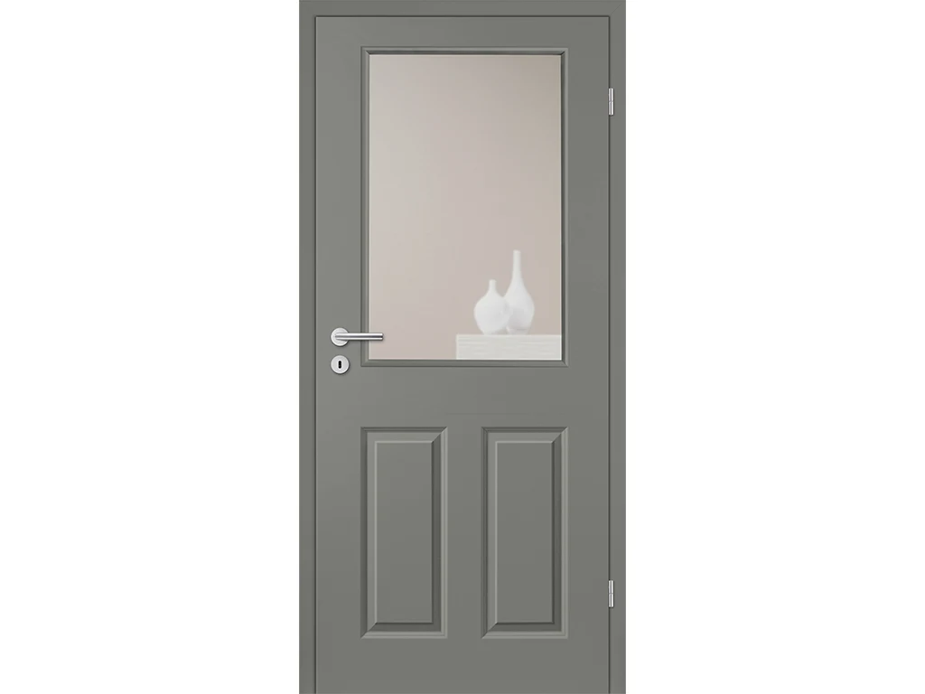 Die Graulacktür der Serie Elegance besticht durch ihre dauerhafte und strapazierfähige Oberfläche aus wasserbasiertem Graulack. Das Türblatt präsentiert sich – passend zum Namen der Serie – in einer edlen Optik und beeindruckt mit dezenten Reliefs und Prägungen, deren feine Linien eine besondere Eleganz und Unaufdringlichkeit ausstrahlen. Eine hochwertige Spritzlackierung sorgt für ein robustes, homogenes und angenehm glattes Erscheinungsbild des Türblatts. Für zusätzlichen Komfort und Sicherheit wird ein Buntbartschloss mitgeliefert. Dank der zweiteiligen Türbänder V0020 WF sind Tür und Zarge zuverlässig miteinander verbunden. Die spezielle Bauweise als Röhrenspantür mit einer Mittellage aus Röhrenspan garantiert nicht nur eine hohe Stabilität des Türblatts, sondern auch eine effiziente Dämmung von Schall und Geräuschen.