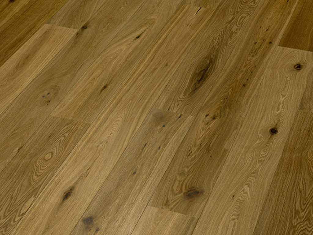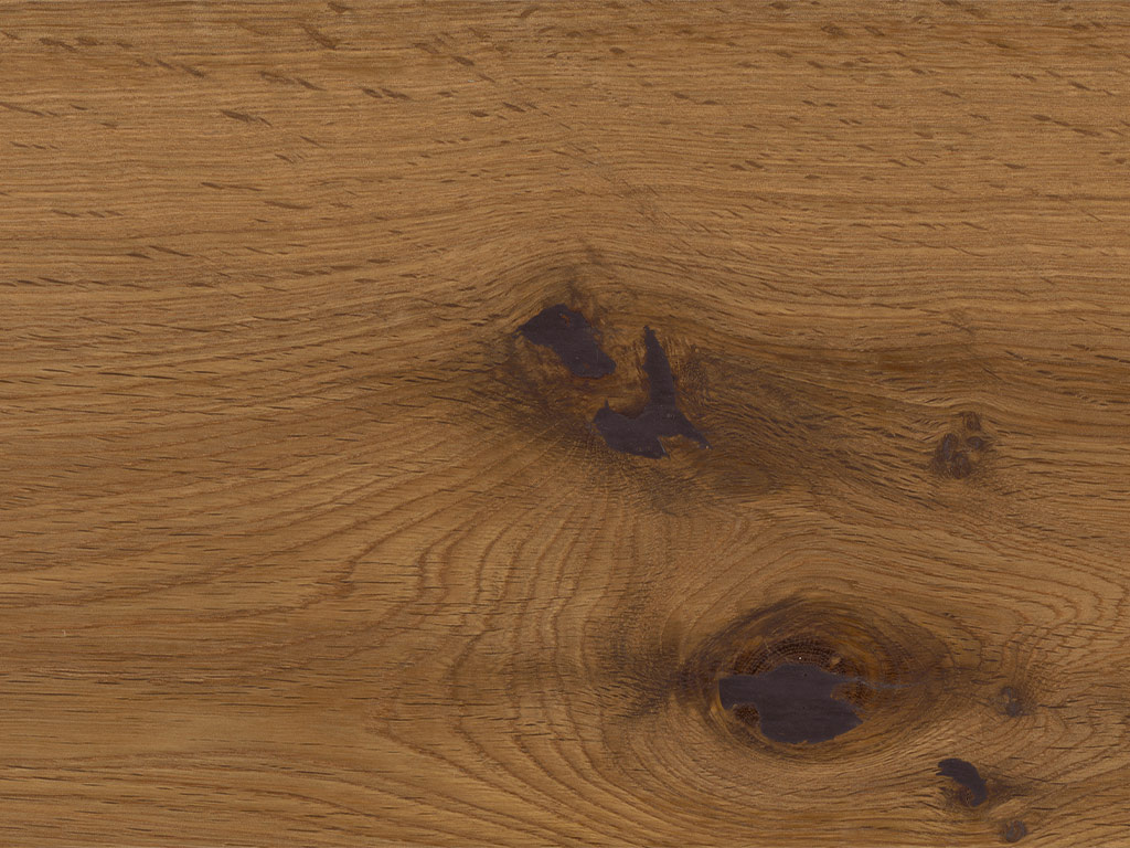Das Parkett ist astig gemasert und zeichnet sich durch einen lebhaften rustikalen Charakter mit Struktur, Farbunterschieden und natürlichen Ästen aus. Markante ausgespachtelte Kernrisse sind möglich.