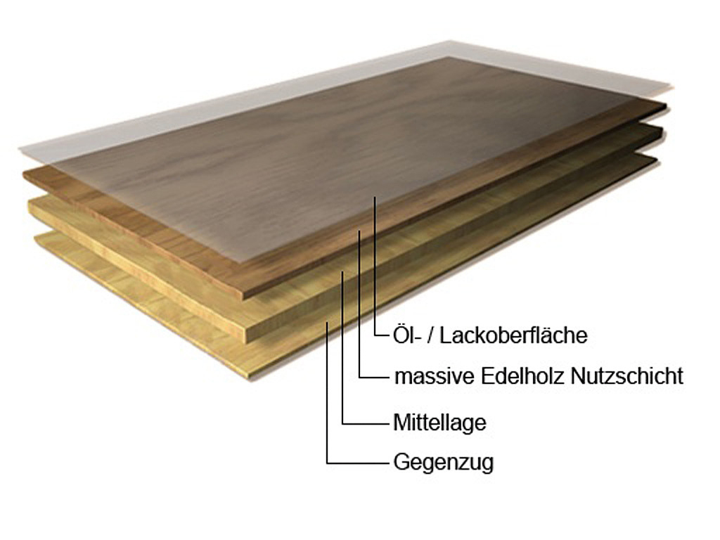 Die Dielen haben eine Breite von 18,9 cm, eine Länge von 186 cm und sind 1,5 mm stark. Mithilfe der Klickverbindung "Drop Down Klick-System" kann der Boden problemlos schwimmend verlegt werden. 3-Schicht-Parkett besteht aus einer Edelholz-Nutzschicht, einer Mittellage aus MDF, HDF oder Holz (z. B. Pappel oder Fichte) sowie einem Gegenzug, der dem Verziehen des arbeitenden Holzes entgegenwirkt. Es besitzt einen symmetrischen Aufbau und damit optimale Dimensionsstabilität bei zum Beispiel höherer Luftfeuchtigkeit. Die 4 mm starke Nutzschicht macht den Bodenbelag besonders pflegeleicht und robust. Für die Verlegung auf einer Warmwasserfußbodenheizung ist das Parkett geeignet.