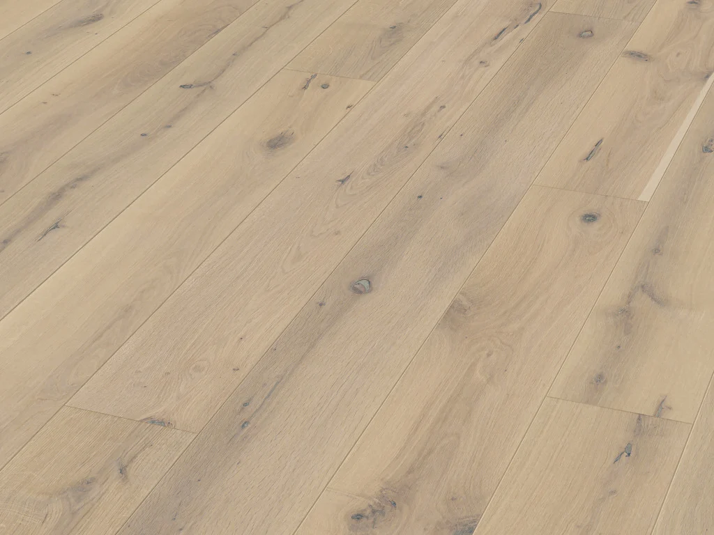 Das Holz der Eiche verleiht diesen Dielen einen urwüchsigen Charakter und schenkt allen Räumen stilvolle Wärme und Behaglichkeit. Neben seiner luxuriösen Optik ist Eichenholz relativ hart, aber dennoch trittelastisch.