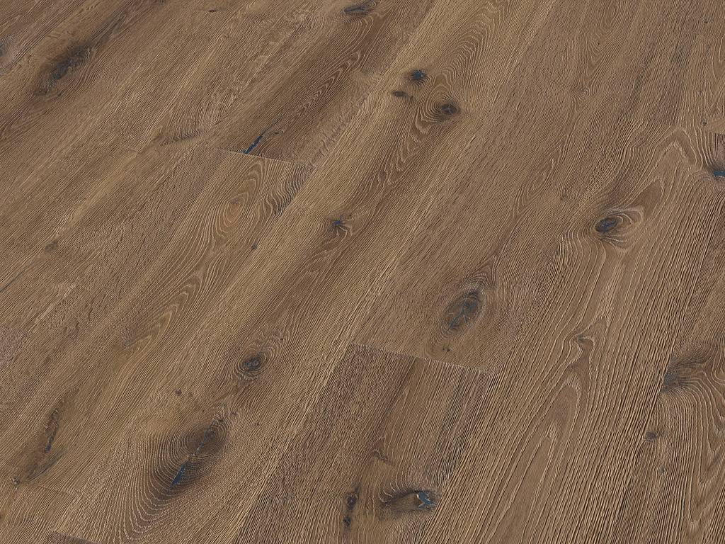 Das Parkett ist astig gemasert und zeichnet sich durch einen lebhaften rustikalen Charakter mit Struktur, Farbunterschieden und natürlichen Ästen aus. Markante ausgespachtelte Kernrisse sind möglich.
