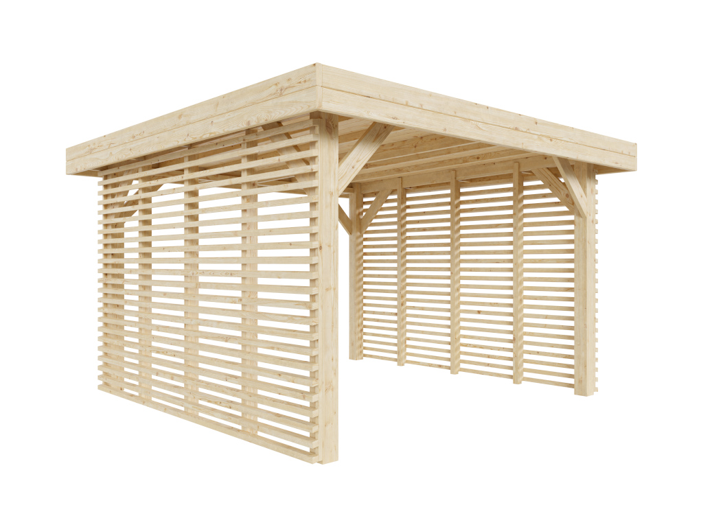 Der halboffene Pavillon mit zwei Lamellenwänden hat eine Breite von 350 cm, eine Höhe von 226 cm und eine Tiefe von 350 cm. Orientiere dich für die Erstellung des Fundaments am Grundriss bzw. an der mitgelieferten Montageanleitung.