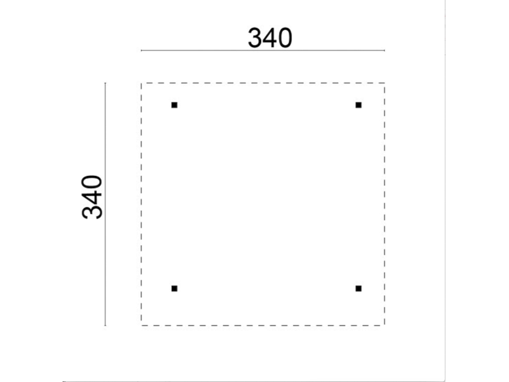 Der Pavillon hat eine Breite von 340 cm, eine Höhe von 301 cm und eine Tiefe von 340 cm. Orientiere dich für die Erstellung des Fundaments am Grundriss bzw. an der mitgelieferten Montageanleitung.