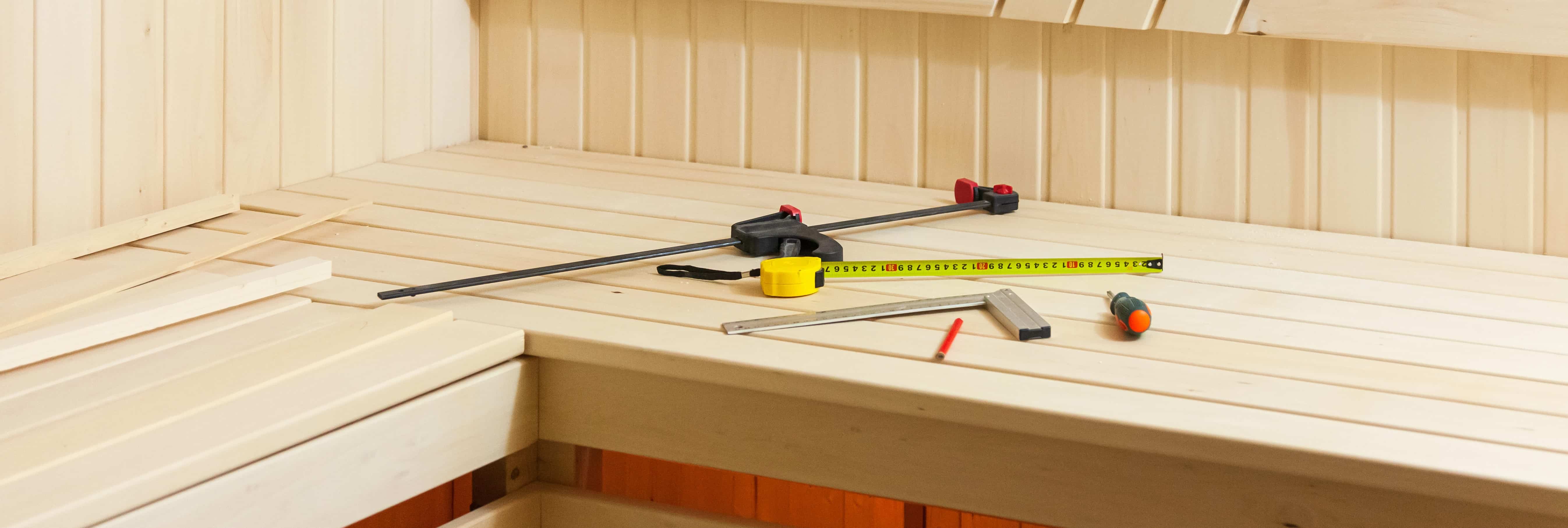 Was wäre eine Sauna ohne gemütliche Liegen? Nach dem Aufbau der Kabine werden nun also noch im Inneren der Sauna die Träger für die Saunaliegen installiert.