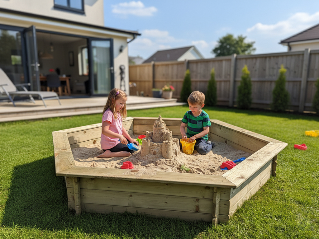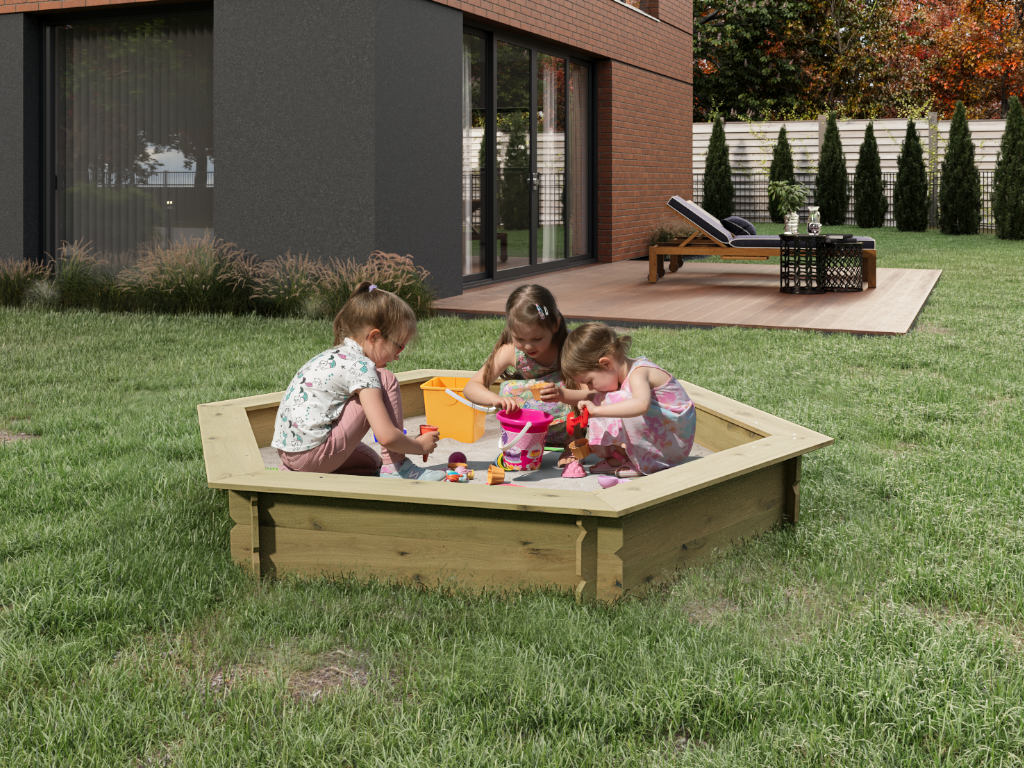 Der sechseckige Kindersandkasten ist ein echter Hingucker im Garten und bietet viel Platz für kleine Baumeister und Sandkuchenbäcker. Hergestellt aus robustem Holz, sorgt er für langlebigen Spielspaß. Die sechseckige Form schafft eine gemütliche Spielfläche, die sich harmonisch in jede Umgebung einfügt. Mit seinen breiten Sitzrändern verfügt der Sandkasten über genügend Platz zum Sitzen und Spielen.