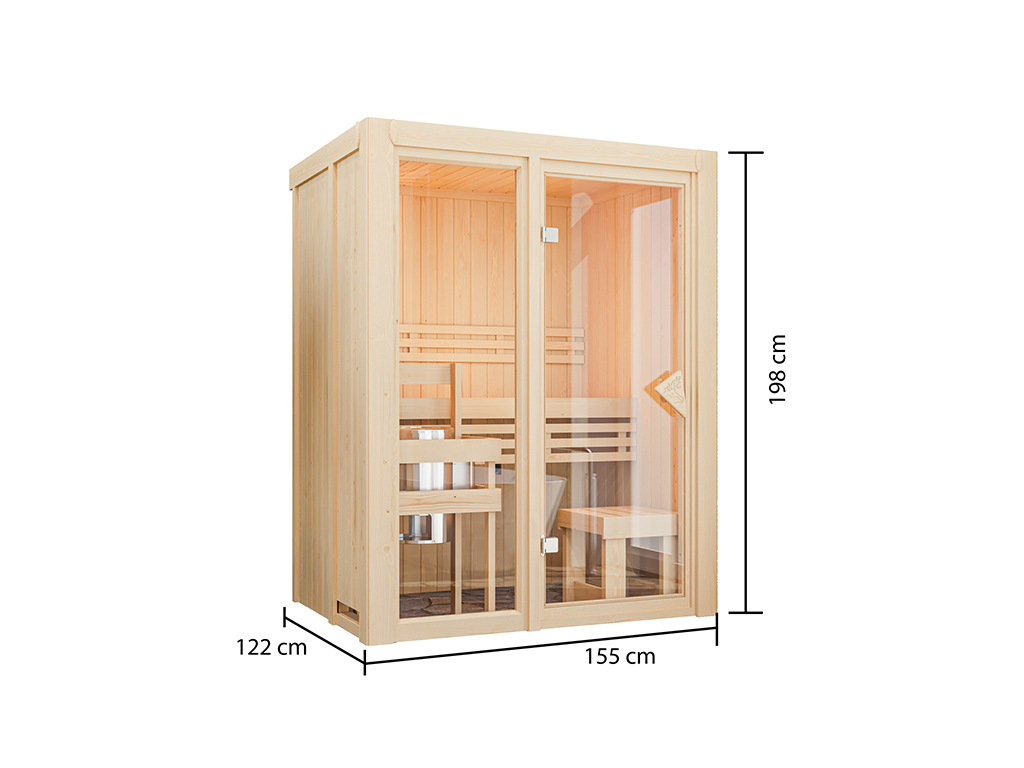 B x T x H: 155 x 122 x 199 cm, Fronteinstieg, inkl. 1 Liege, inkl. 3,6 kW Saunaofen + ext. Steuerung