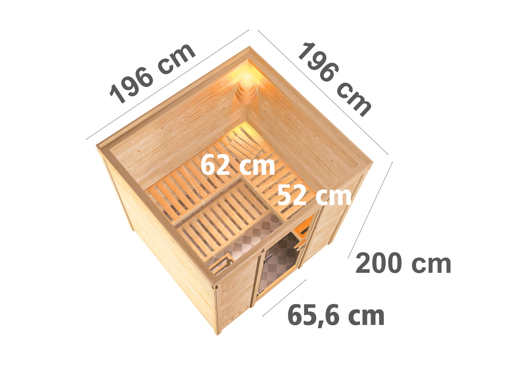 B 196 x T 196 x H 200 cm, 3 Liegen, inkl. 9 kW Saunaofen mit integrierter Steuerung