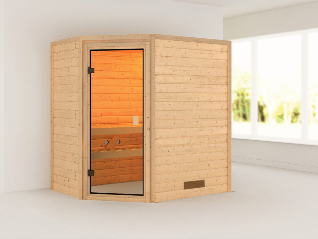 Massivholzsauna 38 mm Katie SPARSET inkl. 4,5 kW Saunaofen und ext. Steuerung