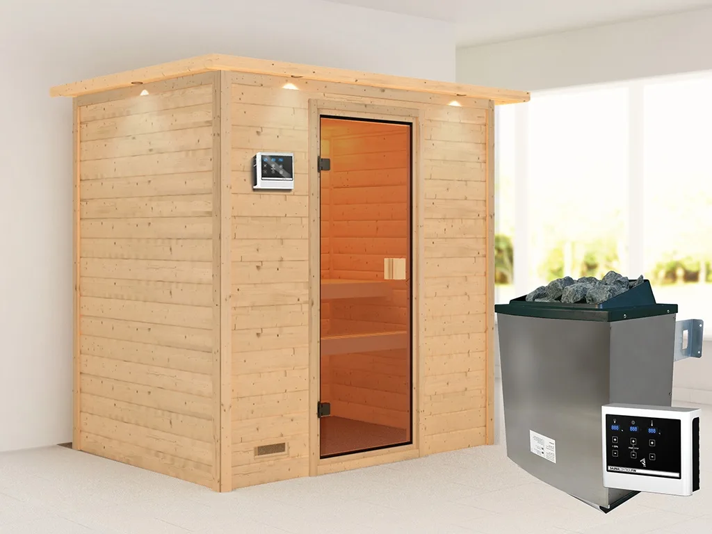Sauna Massivholzsauna Selena mit Dachkranz, inkl. 9 kW Ofen mit externer Steuerung