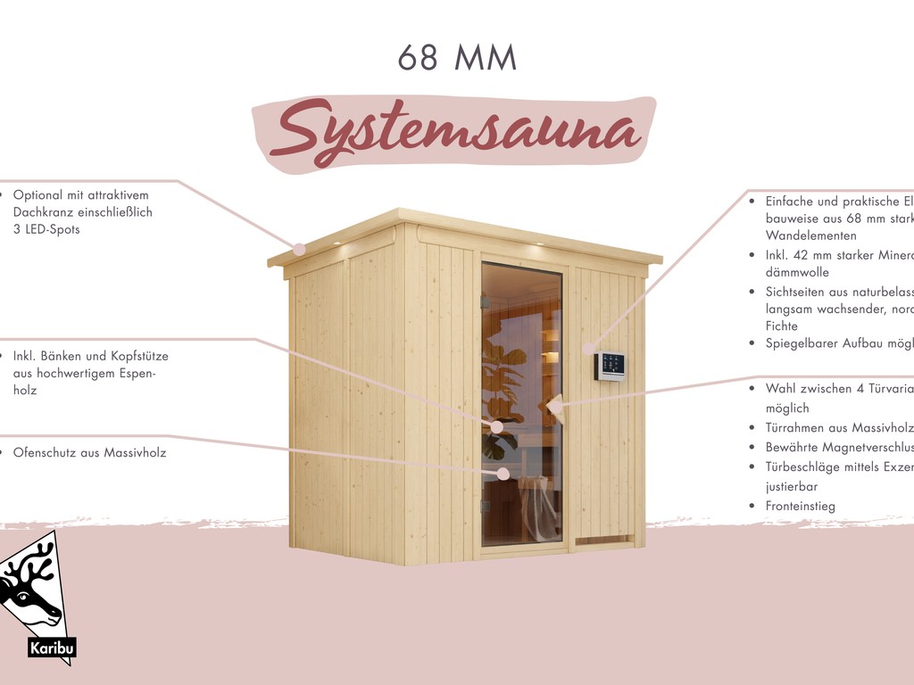 Sauna Systemsauna Bodin mit Dachkranz, inkl. 9 kW Bio-Ofen mit externer Steuerung