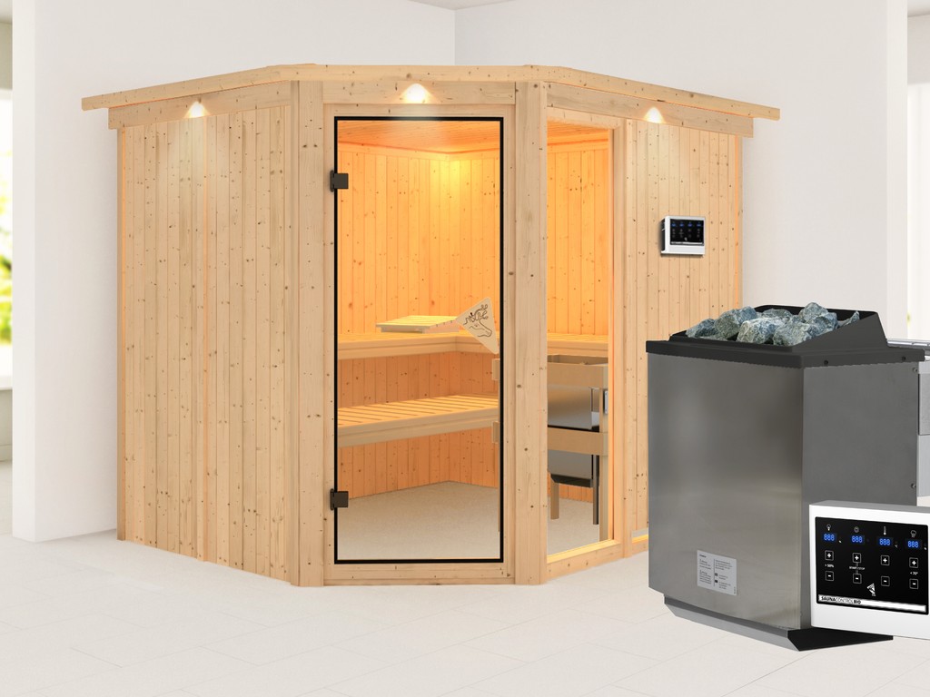 Sauna Systemsauna Fiona 3 mit Dachkranz, inkl. 9 kW Bio-Kombiofen ext. Steuerung