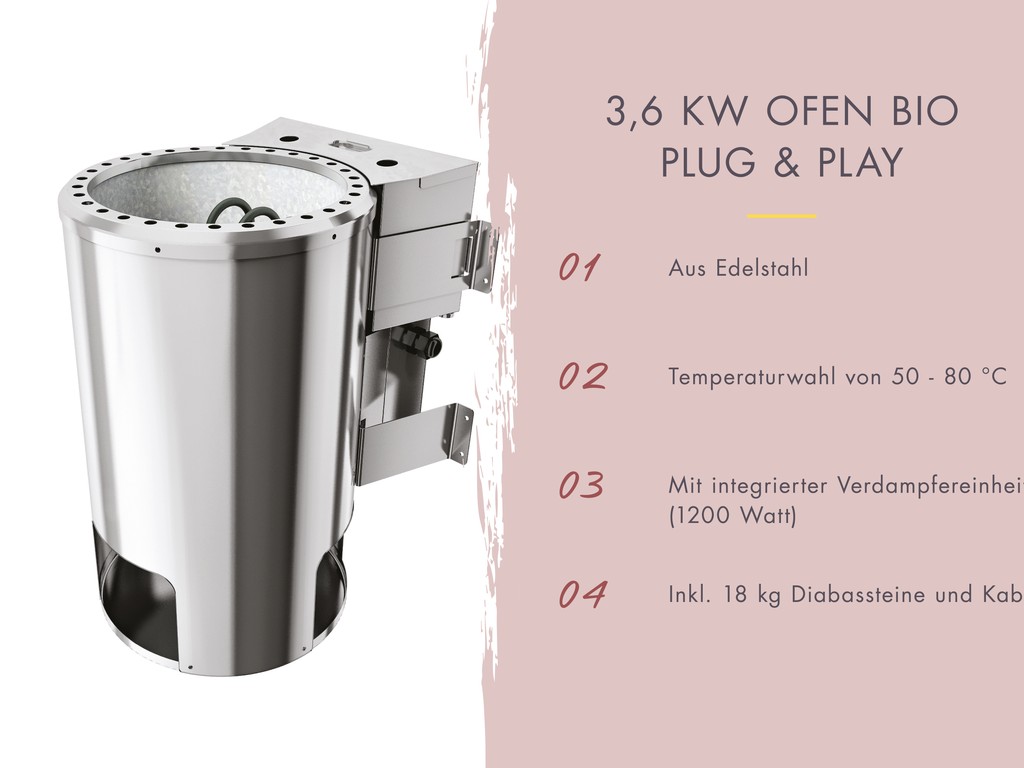 Das Herzstück einer Sauna ist ihr Ofen: Er haucht ihr Leben ein, bestimmt wie warm es wird und welche Art von Saunagang genossen werden kann. Dieser 3,6 kW (16 A) starke Bio-Kombiofen erreicht eine Temperatur bis zu 80 °C, wird steckerfertig geliefert und ist besonders sparsam im Betrieb. Mit dem Zusatz als Bio-Kombiofen hat er obendrein noch eine spezielle Dampf-Einheit und ermöglicht damit gleich vier facettenreiche Saunagang-Variationen: die besonders heiße und trockene finnische Sauna, die stärkende Kräuterdampf-Kur, das feuchtwarme Soft-Dampfbad und das schonende Familienbad.