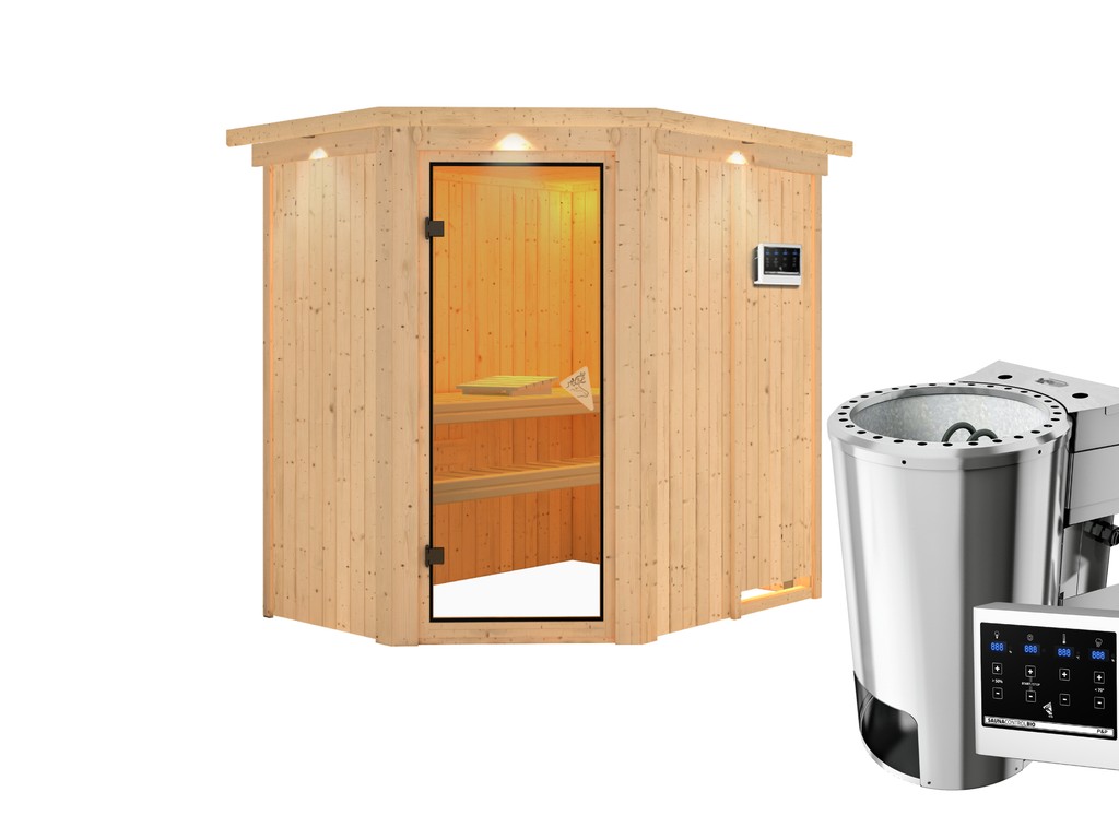 Sauna Systemsauna Saja mit Dachkranz, inkl. Plug & Play Bio-Ofen externe Steuerung
