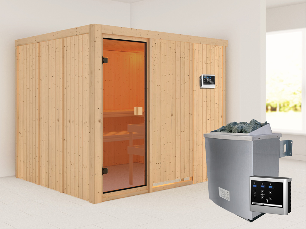 B x T x H: 231 x 196 x 198 cm, 3 Liegen, inkl. 9 kW Saunaofen, ext. Steuerung