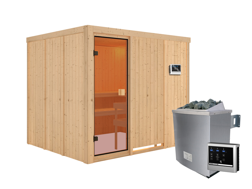 Bei dieser Innensauna ist ein Saunaofen mit einer externen Steuerung inklusive. Das Steuergerät wird außerhalb der Sauna angebracht. Auf diese Weise fängt schon vor dem Saunieren der Komfort an–mit einer bequemen Bedienung von außen und einer noch exakteren Temperatureinstellung. Weitere elektrische Geräte, wie die Kabinenbeleuchtung, können ebenso an die externe Steuerung angeschlossen und bedient werden.