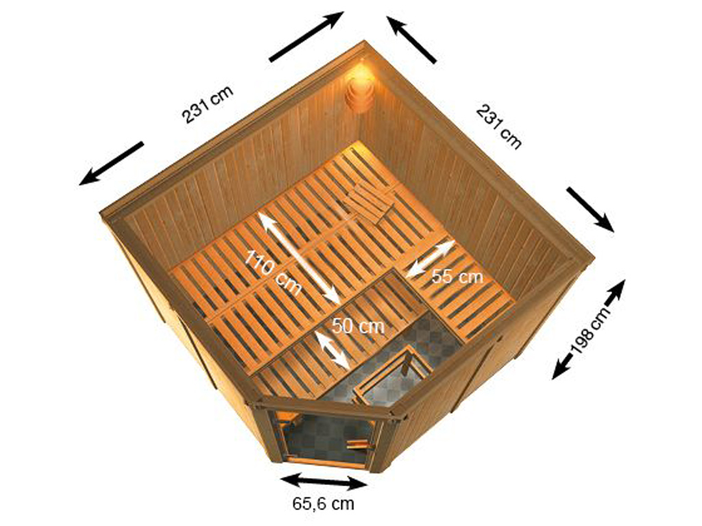 B x T x H: 231 x 231 x 198 cm, 3 Liegen, inkl. 9 kW Saunaofen, ext. Steuerung