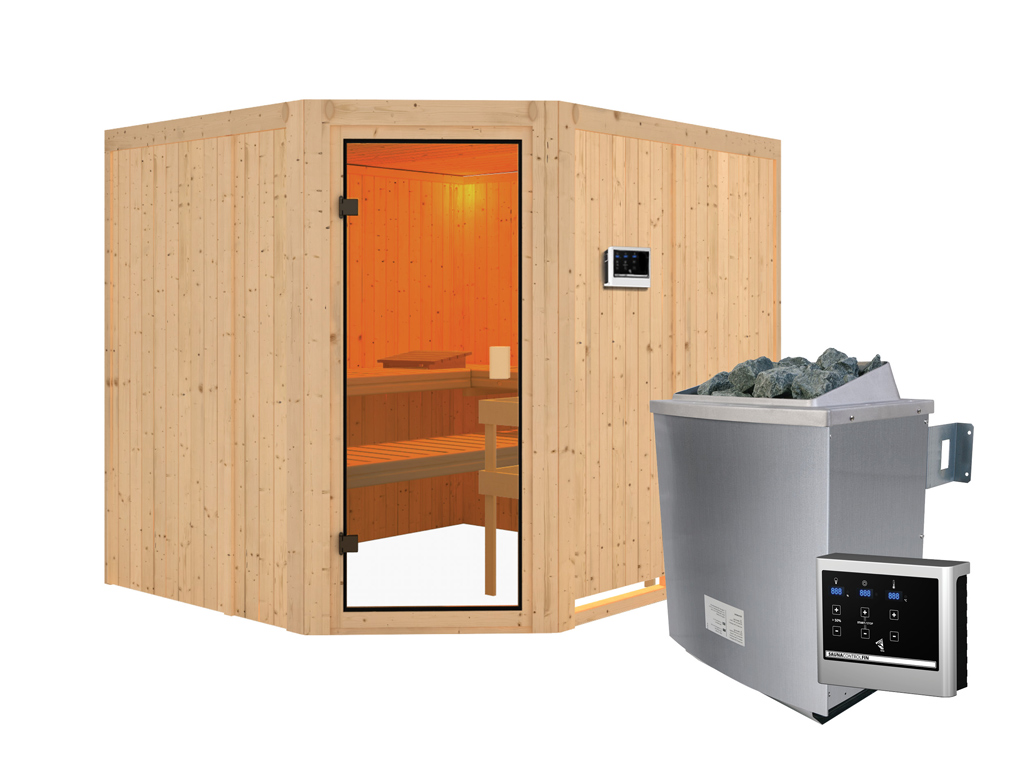 Bei dieser Innensauna ist ein Saunaofen mit einer externen Steuerung inklusive. Das Steuergerät wird außerhalb der Sauna angebracht. Auf diese Weise fängt schon vor dem Saunieren der Komfort an–mit einer bequemen Bedienung von außen und einer noch exakteren Temperatureinstellung. Weitere elektrische Geräte, wie die Kabinenbeleuchtung, können ebenso an die externe Steuerung angeschlossen und bedient werden.
