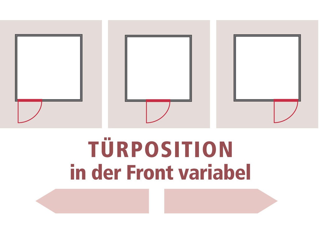 Besonders erwähnenswert ist, dass man diese Tür an der Frontseite der Sauna individuell anpassen kann–sie kann links, rechts oder mittig positioniert werden.