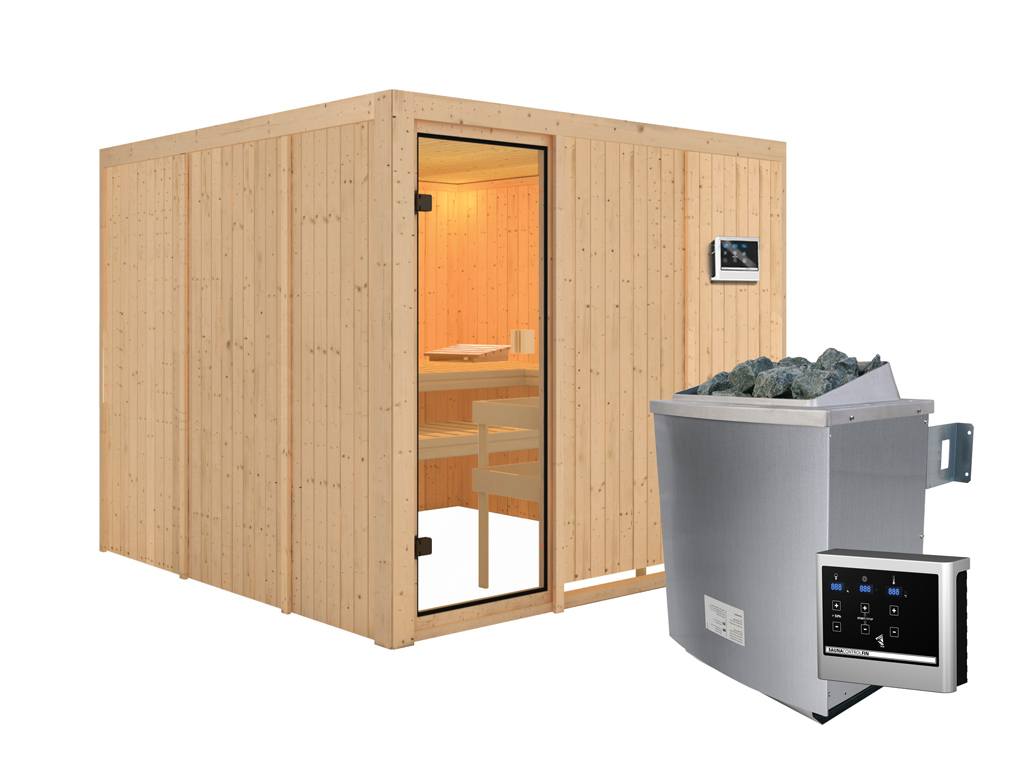 B x T x H: 231 x 231 x 198 cm, 3 Liegen, inkl. 9 kW Saunaofen, ext. Steuerung