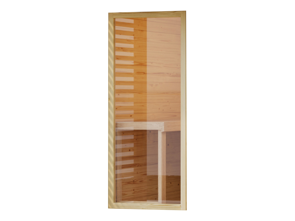 Die naturbelassene Oberfläche ermöglicht eine individuelle Weiterverarbeitung, etwa durch Lasuren oder Öle, passend zum jeweiligen Designkonzept. Das klare Glas sorgt für Helligkeit und eine offene Raumwirkung, ohne die Funktionalität der Kabine zu beeinträchtigen.