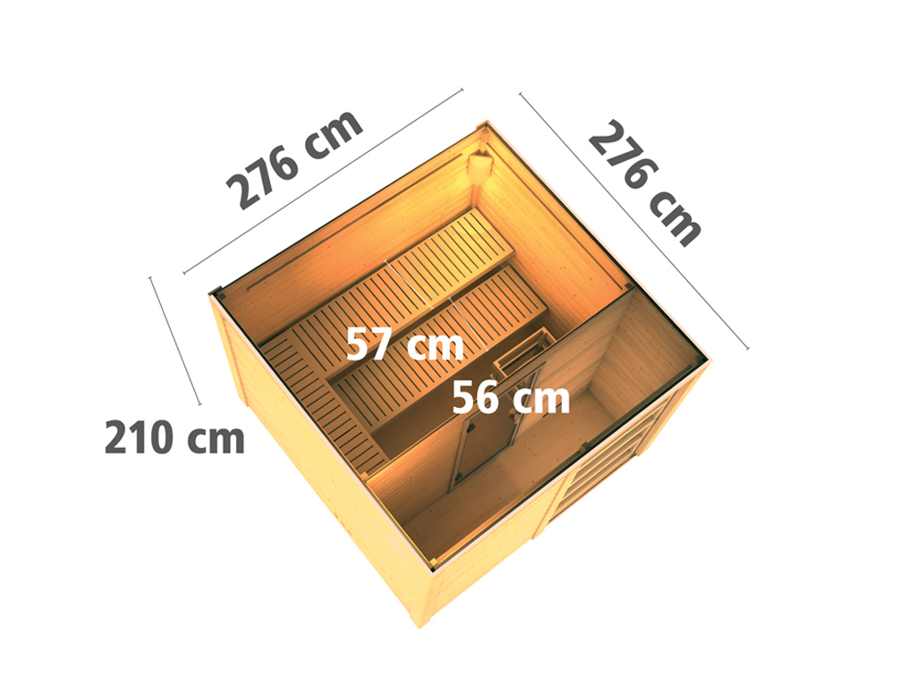 B x T x H: 276 x 276 x 210 cm, inkl. 3 Liegen, inkl. 9 kW Bio-Kombiofen + ext. Steuerung