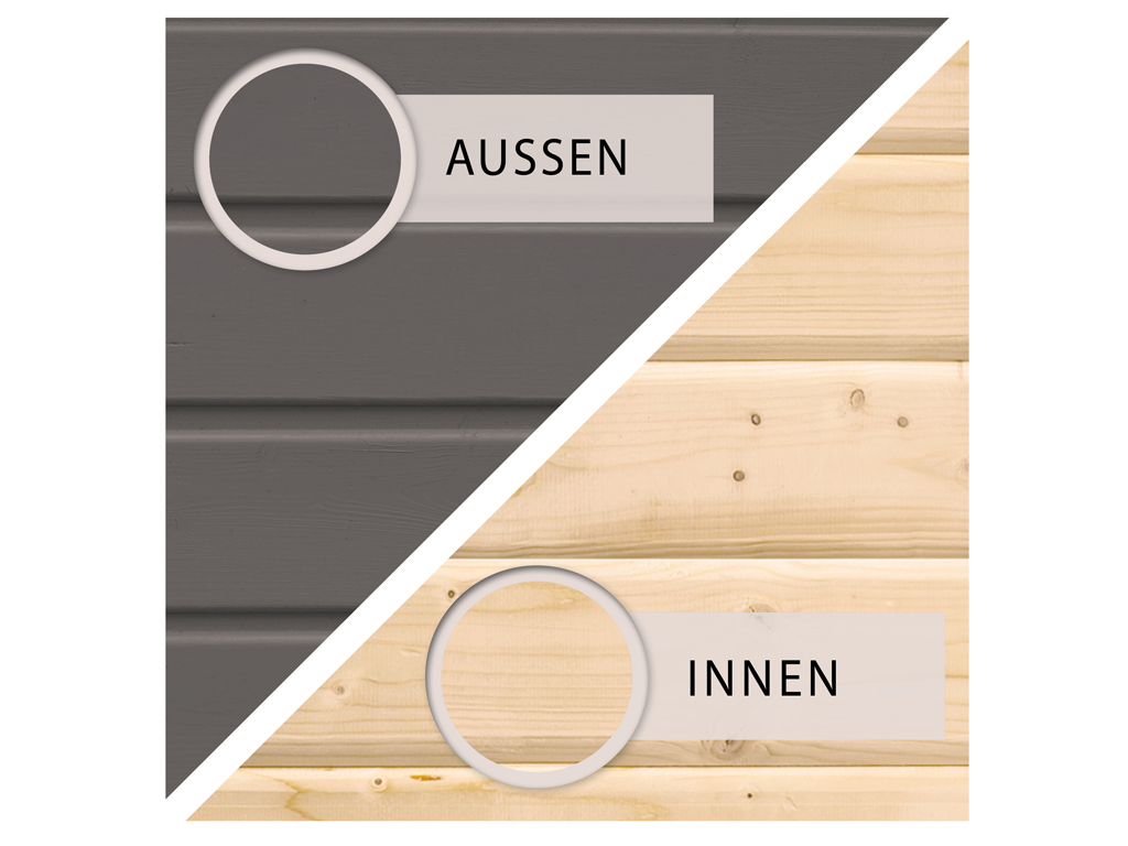 Die Außenwände des Gartenhauses sind bereits durch eine Holzschutzlasur in der Farbe Terragrau versiegelt und schützen es von Anfang an vor Schädlingen und Witterungseinflüssen. - Inkl. Vorraum