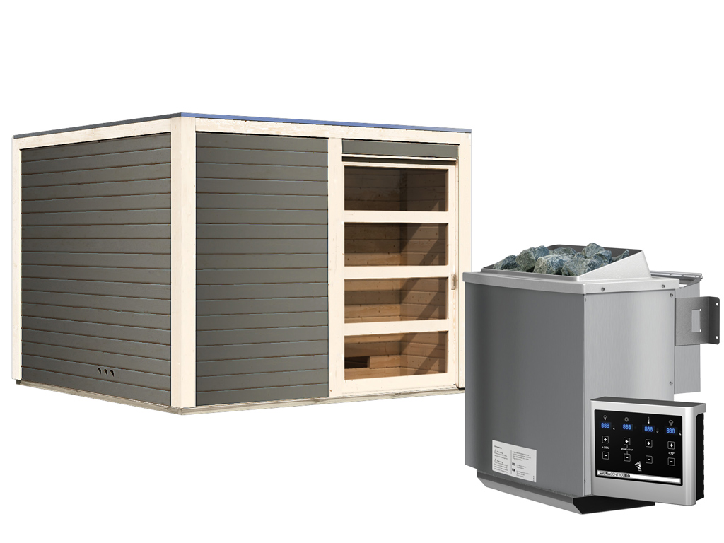 Saunahaus Cuben 38 mm terragrau inkl. 9 kW Bio-Kombiofen ext. Steuerung