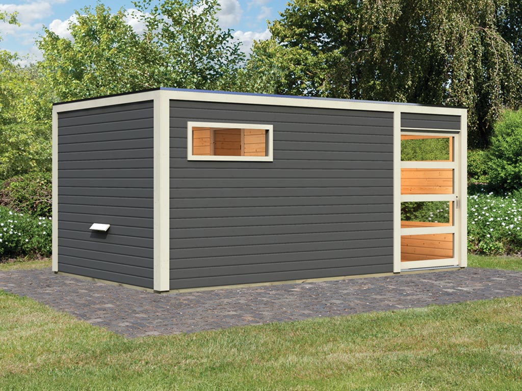 Die drei stabilen Bankliegen aus Espenholz erhöhen den Komfort in diesem Saunahaus. Zusätzlich ist ein Ofenschutzgitter aus massivem Fichtenholz und ein Massivholzboden im Lieferumfang enthalten. Die Außenwände des Gartenhauses sind bereits durch eine Holzschutzlasur in der Farbe Terragrau versiegelt und schützen es von Anfang an vor Schädlingen und Witterungseinflüssen. Der integrierte Vorraum lässt sich perfekt zum Umziehen oder Abstellen von Sauna-Zubehör verwenden. Die Mineralwolldämmung in der Saunadecke sorgt zusätzlich für einen niedrigen Energieverbrauch. Inklusive Montageanleitung. - Schiebetür