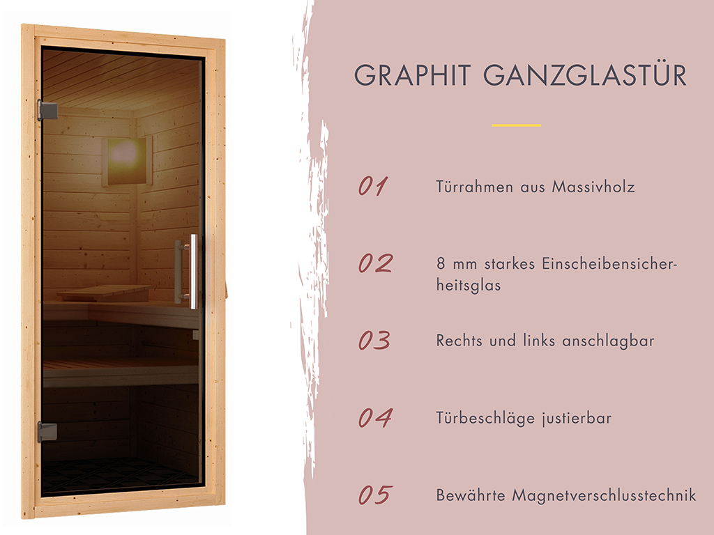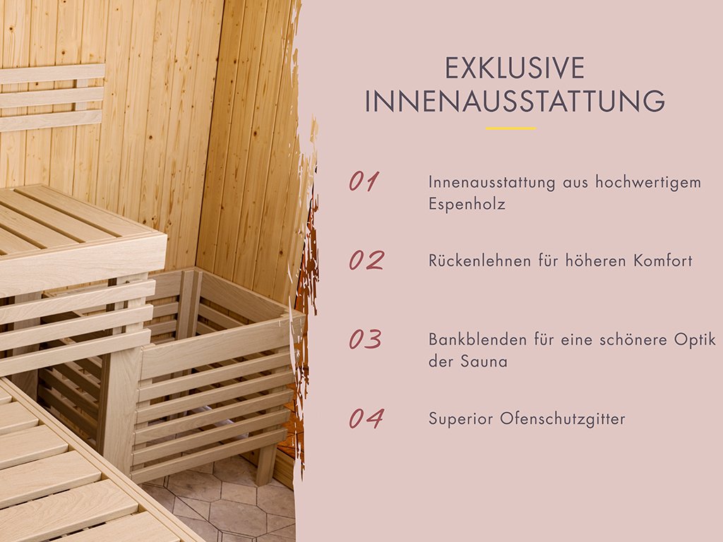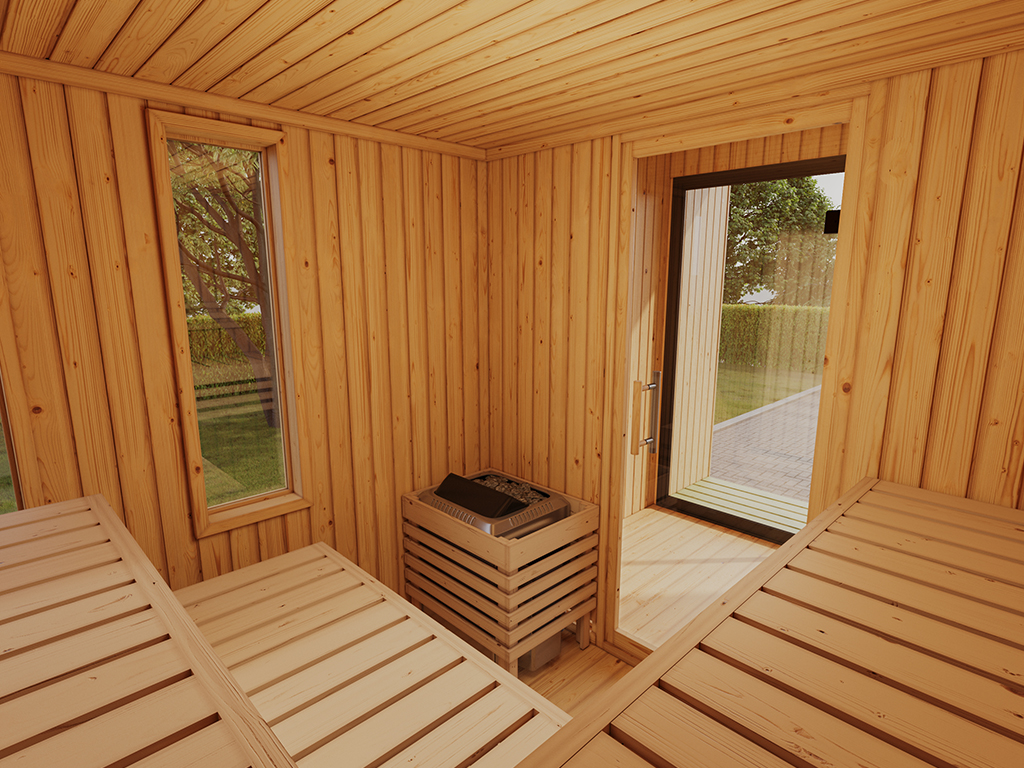 - Bodenrost aus fußwarmem Fichtenholz: für angenehmes Auftreten innerhalb und außerhalb der Sauna.