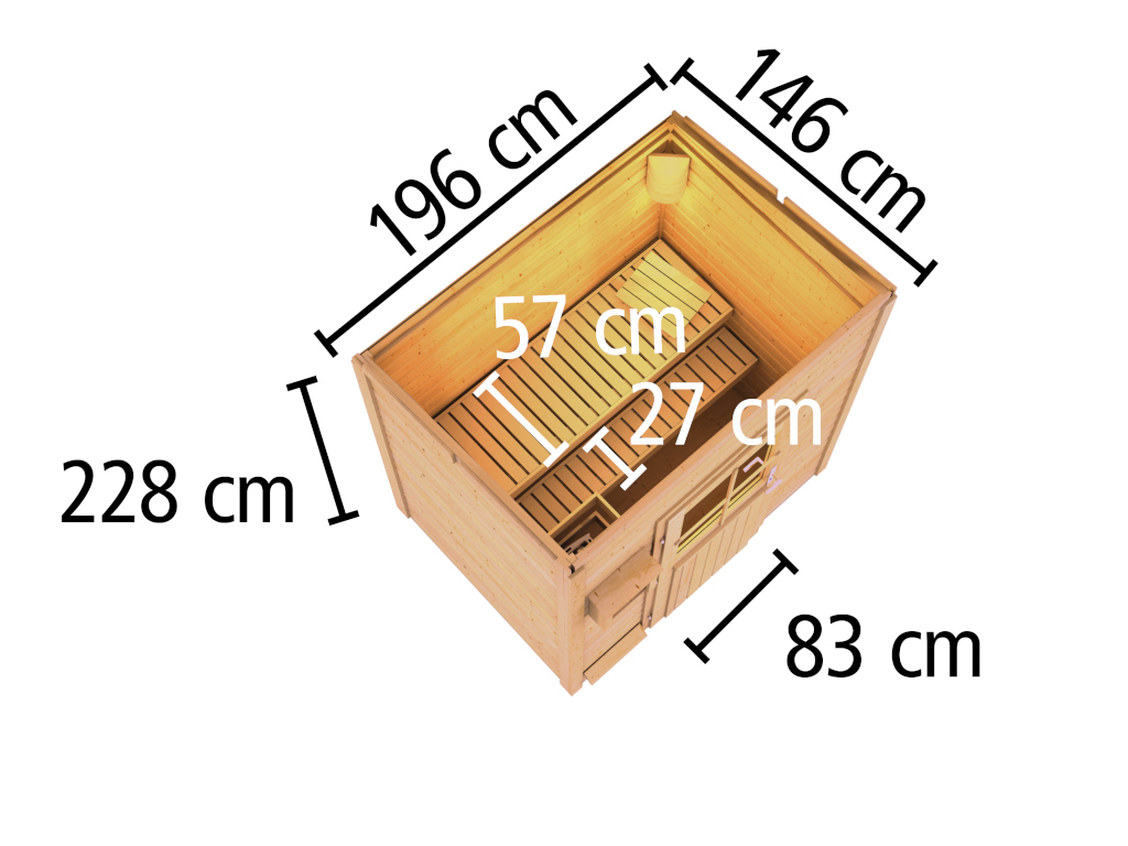 - Bitte beachten: Im Lieferumfang dieser Sauna ist KEIN Saunaofen enthalten. Von dieser Sauna sind jedoch Varianten inkl. Saunaofen erhältlich (siehe oberhalb des Warenkorb-Buttons). Zusätzlich findest du im Onlineshop eine große Auswahl an verschiedenen Öfen.