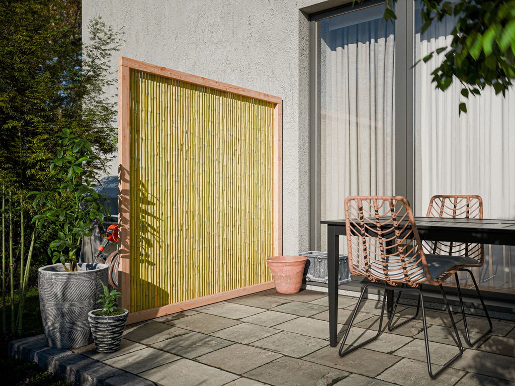 Bambus ist als schnellwachsender Rohstoff eine umweltfreundliche Alternative zum gängigen Rohstoff Holz. Durch thermische Modifizierung werden die Bambusfasern zuerst für den Einsatz im Außenbereich vorbereitet und anschließend wasserfest verleimt und gepresst. Das Resultat ist ein besonders dichtes, stabiles und hartes Material – das ideale und haltbare Element für den Außenbereich. Durch Hobeln und Ölen erhalten die Bambusdielen ihre schöne Oberfläche.