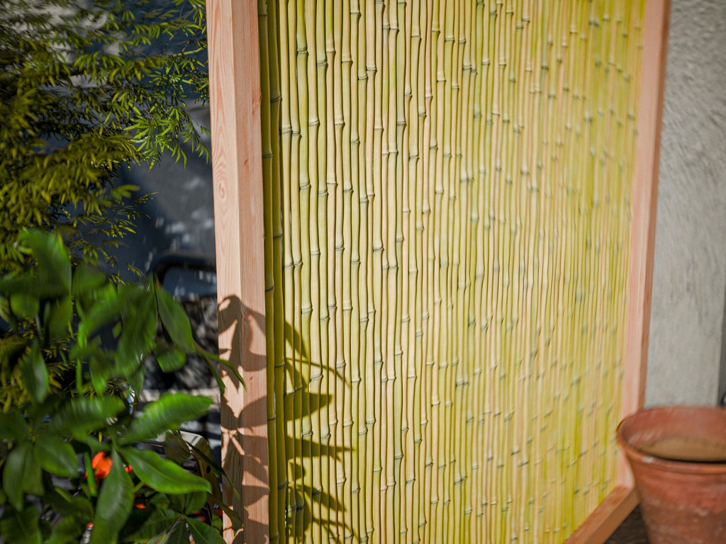 Mit der Zeit verändert sich die Farbe jedoch auf ganz natürliche Weise. Durch den Trocknungsprozess verliert der Bambus nach und nach Feuchtigkeit, wodurch sich das Chlorophyll abbaut. Parallel setzt eine sanfte Oxidation ein: Natürliche Zucker und Lignine reagieren mit dem Sauerstoff der Luft und lassen den Bambus von grün in warme Gelb- und Brauntöne übergehen. Dieser Farbwandel verleiht jedem Bambuszaun seine individuelle, authentische Ausstrahlung.