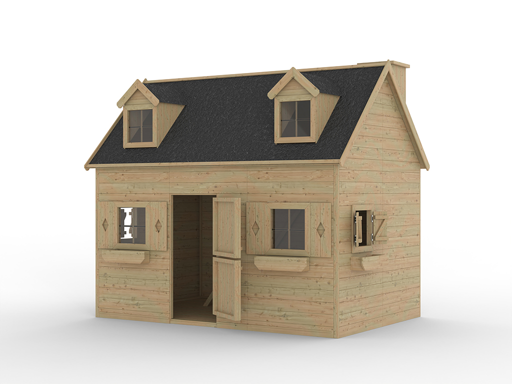 Die Grundkonstruktion besteht aus kesseldruckimprägniertem Profilholz und ist somit besonders witterungsbeständig. Nach vollständiger Trocknung kann das Spielhaus nach Lust und Laune mit einem Farbanstrich gestrichen werden. Wir empfehlen hierzu eine offenporige, hoch pigmentierte Holzschutzfarbe. - Inkl. Fußboden