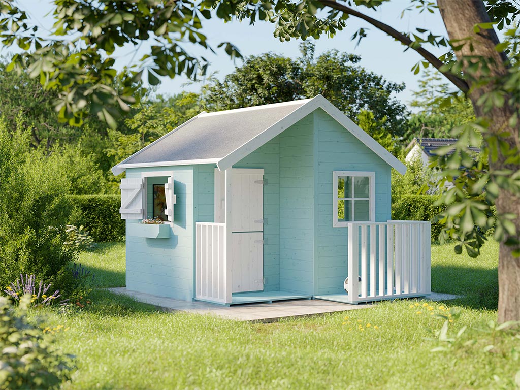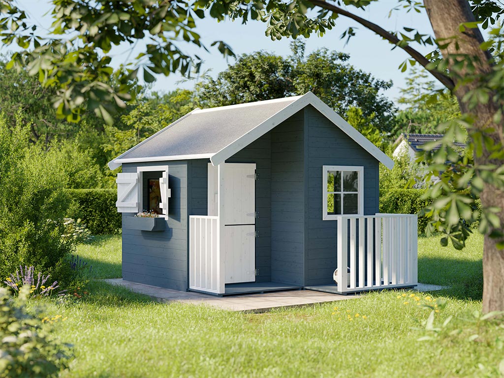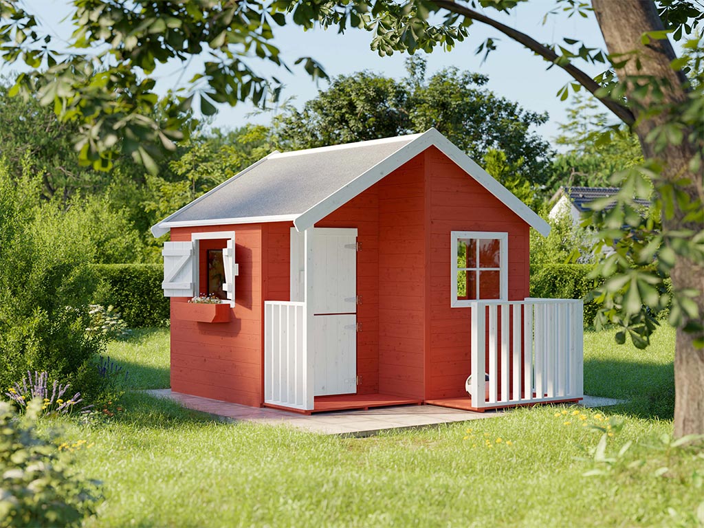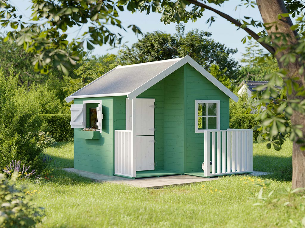 Das Spielhaus mit Veranda wird mit Einzeltür und 3 Fenstern geliefert und sorgt für großes Spielvergnügen bei den Kindern.