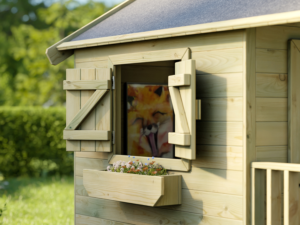 Die zweigeteilte Einzeltür und die drei Fenster bringen viel Licht ins Innere dieses schöne Kinderspielhauses. Das Fenster in der Front ist mit einem Kunstglaseinsatz ausgestattet. Die zwei Fenster in den Seitenwänden werden inklusive Blumenkästen und Fensterläden geliefert und lassen sich damit verschließen. Sowohl Fenster als auch die Holztür sind mit einem Fingerklemmschutz (Spalt zwischen Fenster/Tür und Hauswand) ausgestattet.