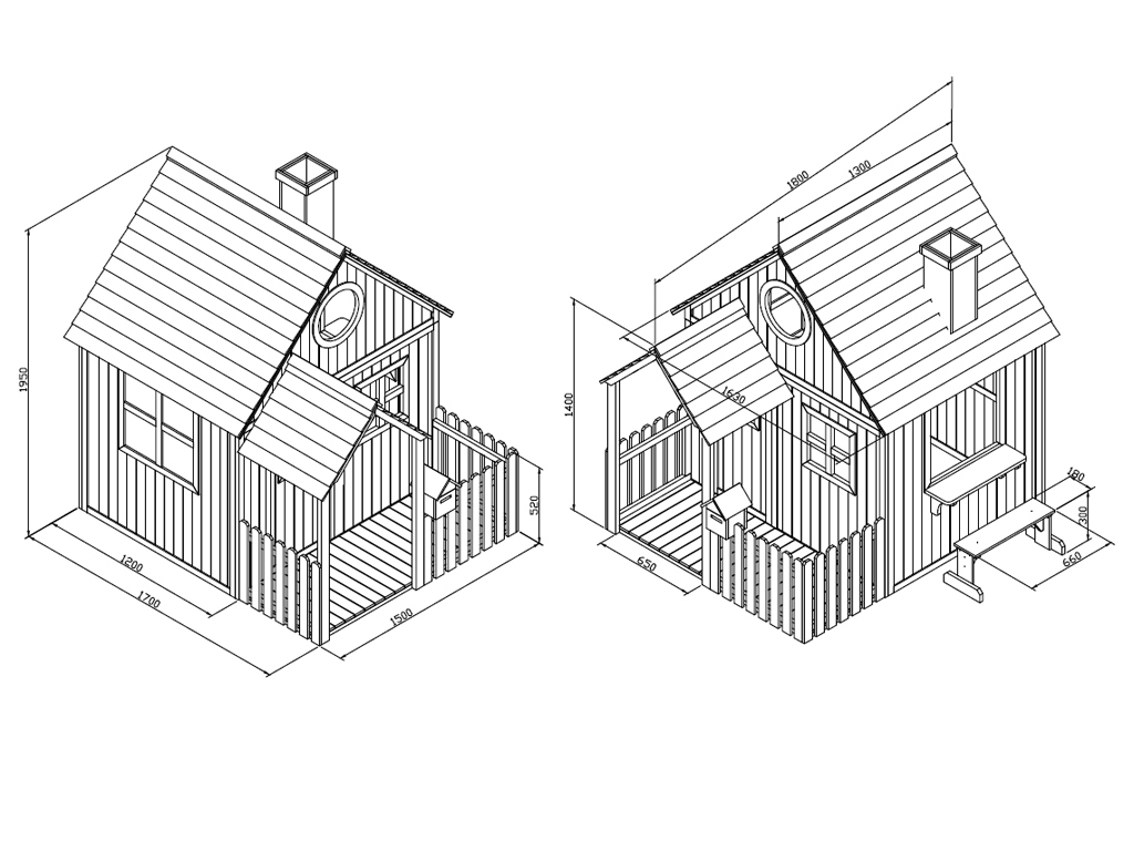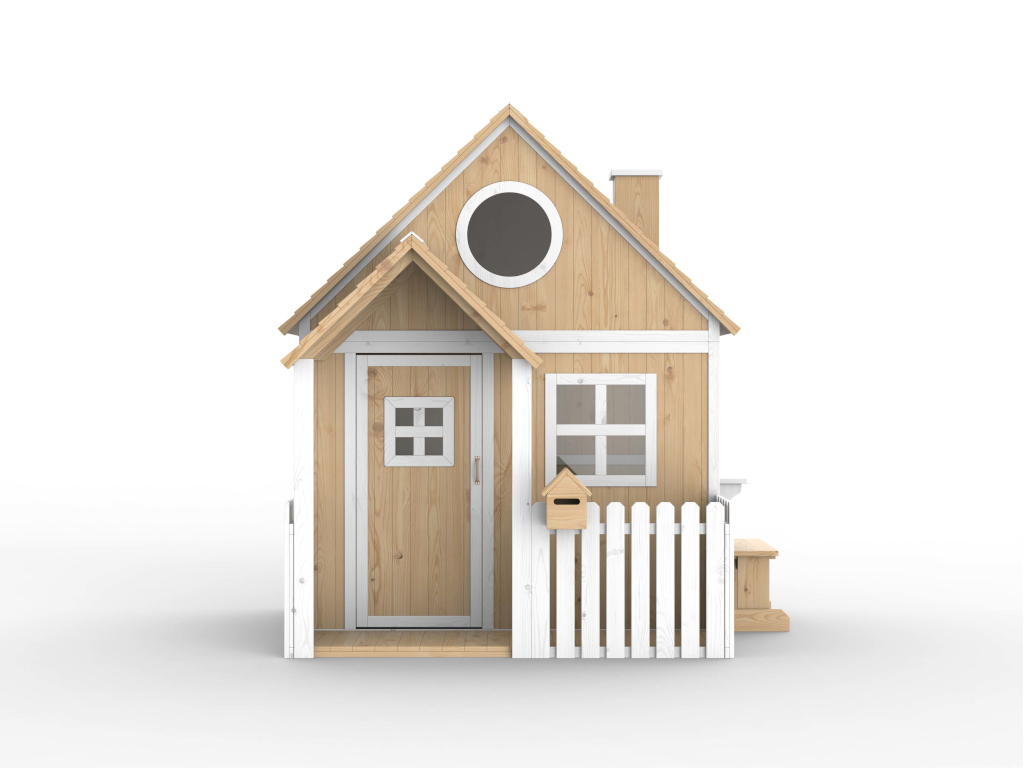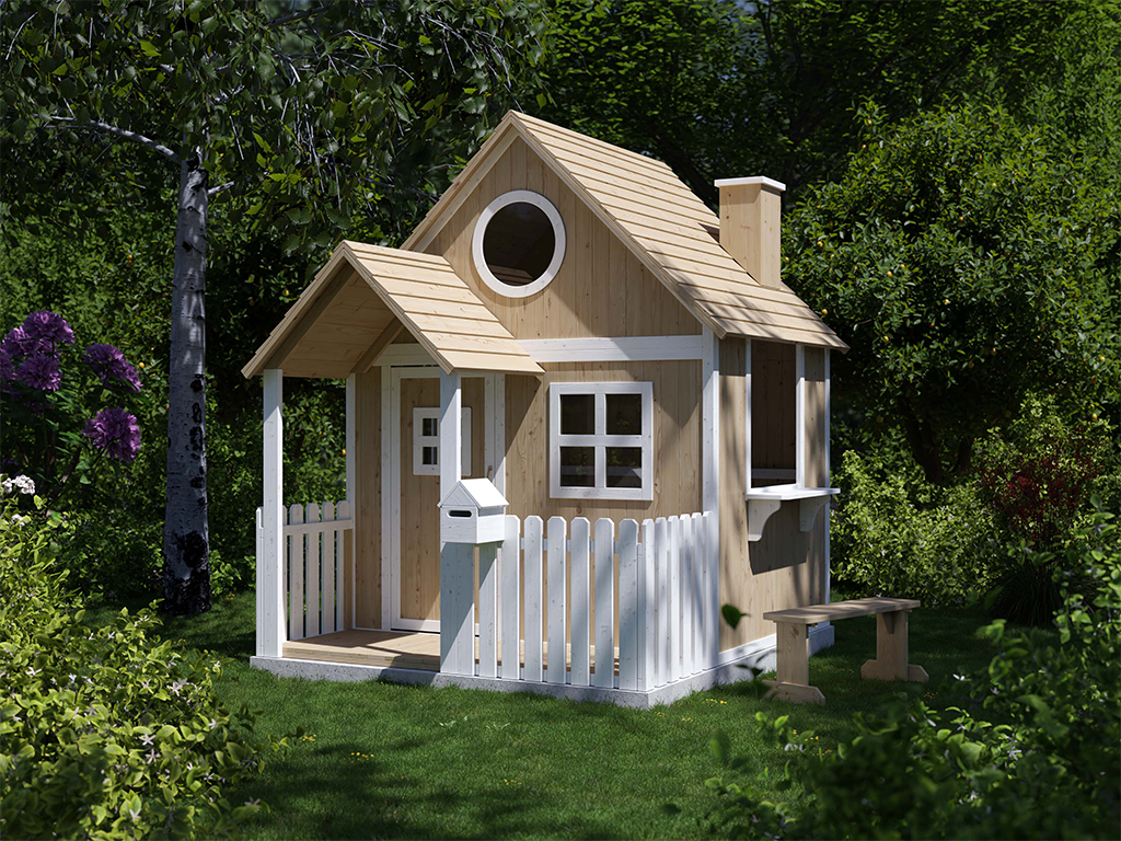 Lieferumfang: Spielhaus Finn, Verkaufsfenster, Sitzbank, Briefkasten, Veranda, detaillierte Montageanleitung