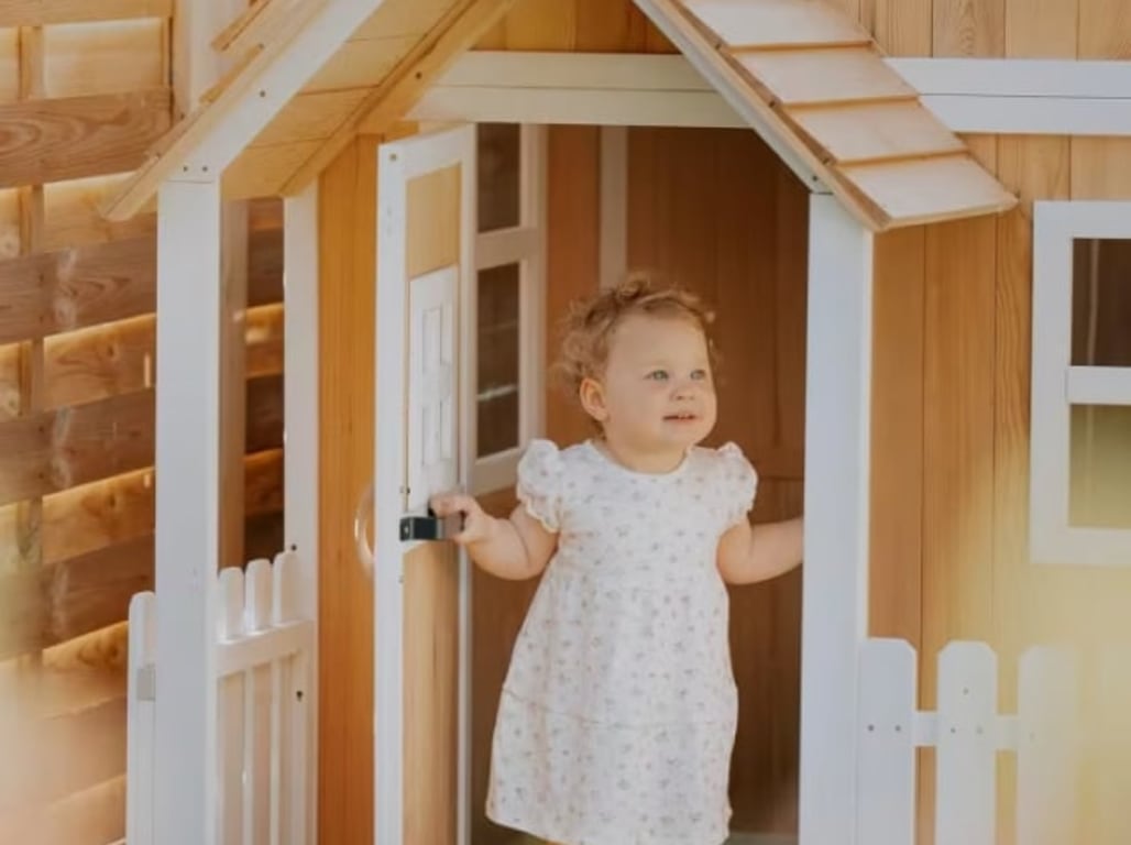Die breite Einzeltür und die drei Fenster aus Kunstglas bringen viel Licht ins Innere dieses Kinderspielhauses und sorgen für ein angenehmes Wohlempfinden.