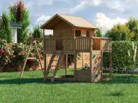 Dieser Spielturm kombiniert Spielturm mit Spielhaus. Der Spielturm verfügt über zwei Podeste, die über eine Leiter auf der einen und eine Kletterwand mit Klettersteinen auf der anderen Seite erklommen werden können. Auf dem Podest befindet sich ein überdachtes Spielhaus mit zwei Eingängen und einem Fensterausschnitt. - Inkl. Rutsche