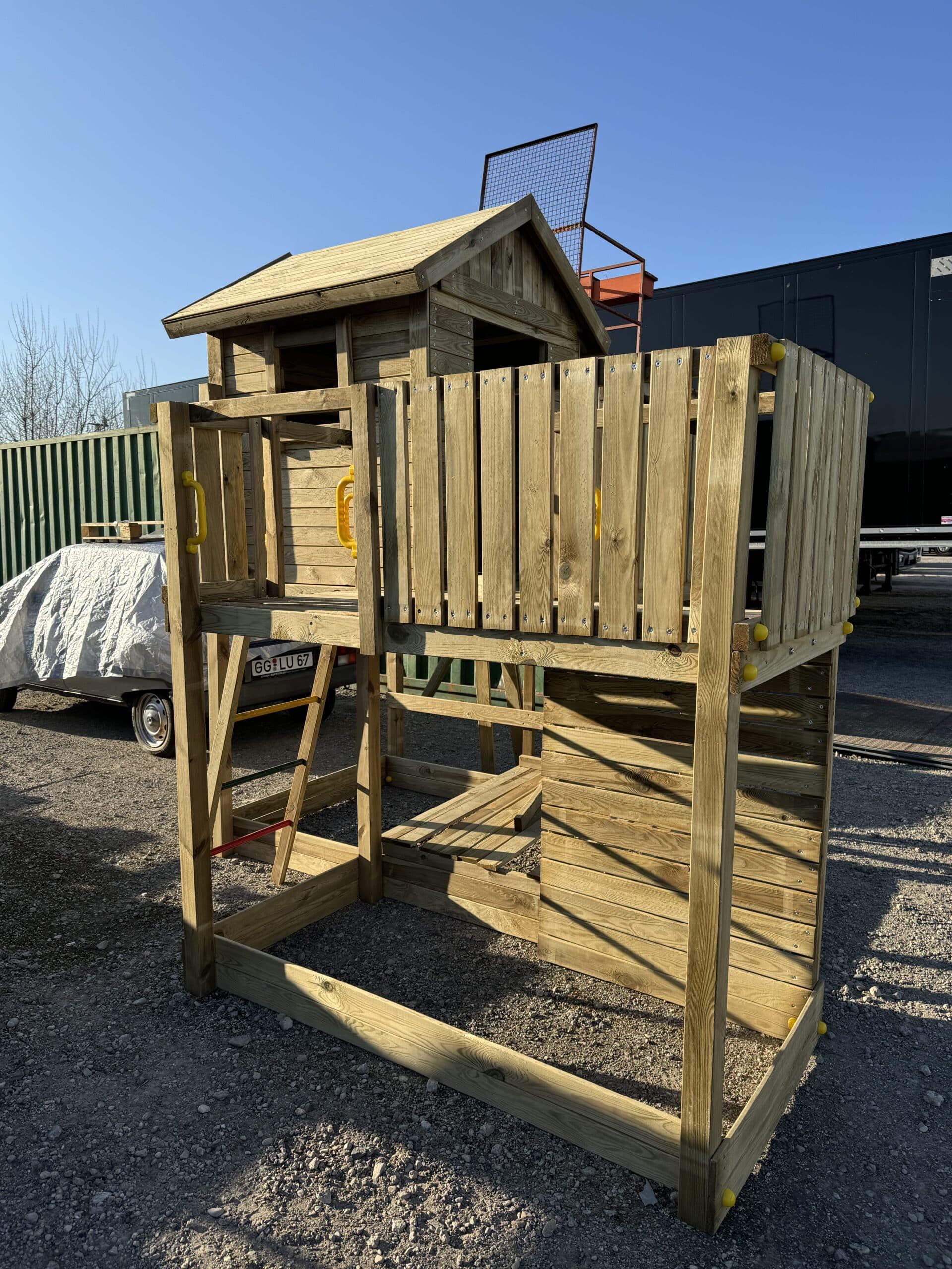 Dieser Spielturm kombiniert Spielturm mit Spielhaus. Der Spielturm verfügt über ein zweiteiliges Podest, das über eine Leiter auf der einen und eine Kletterwand mit Klettersteinen auf der anderen Seite erklommen werden kann. Auf dem Podest befindet sich ein überdachtes Spielhaus mit einem Fensterausschnitt. - Inkl. Picknick-Tisch & Sandkasten
