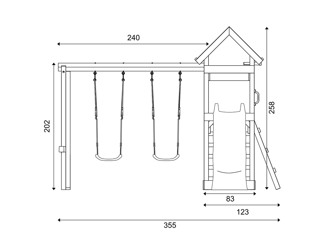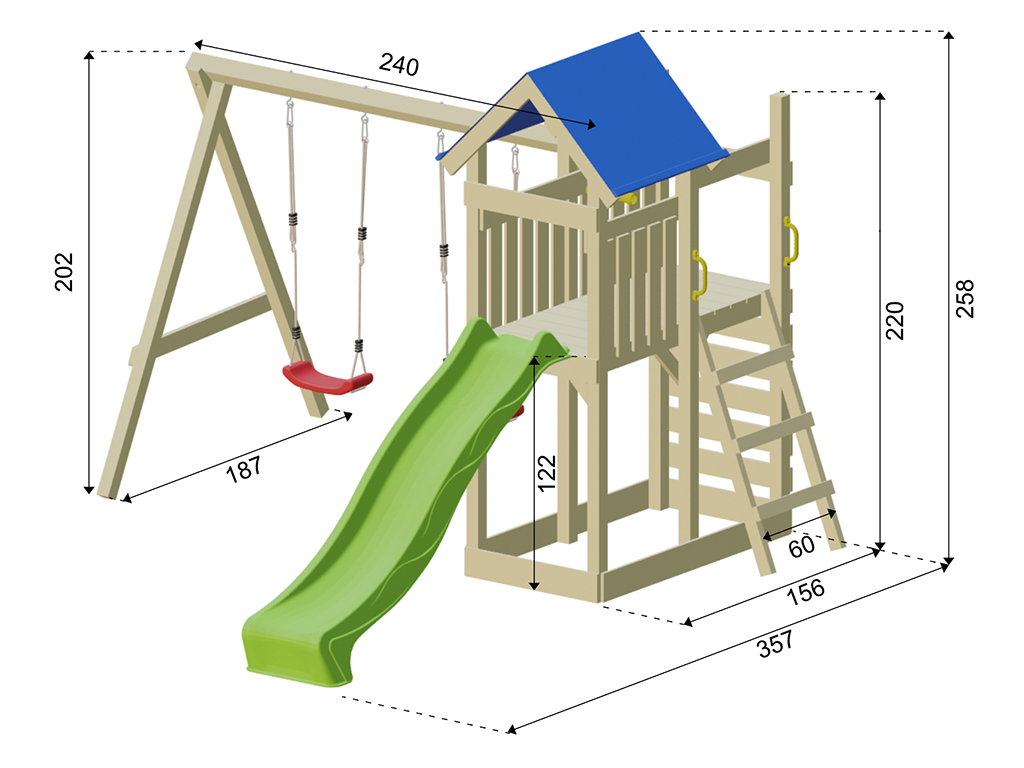 Dieser Spielturm bietet deinem Kind einzigartige Erlebnisse mit viel Bewegung und Abenteuer – ein wahrer Spieltraum! Das Außenmaß dieses Spielturms beträgt 355 x 386 cm. Die Firsthöhe liegt bei 258 cm.