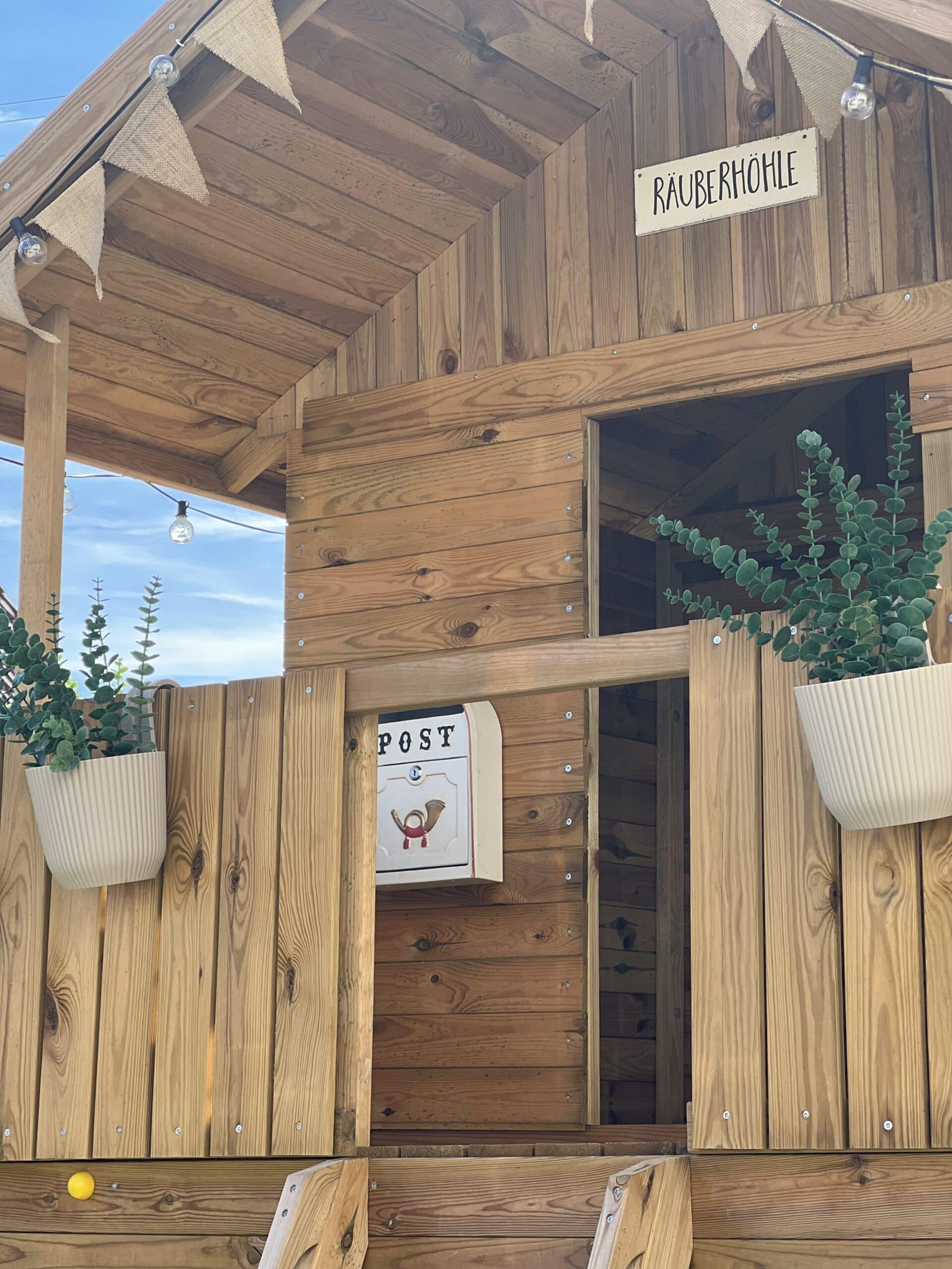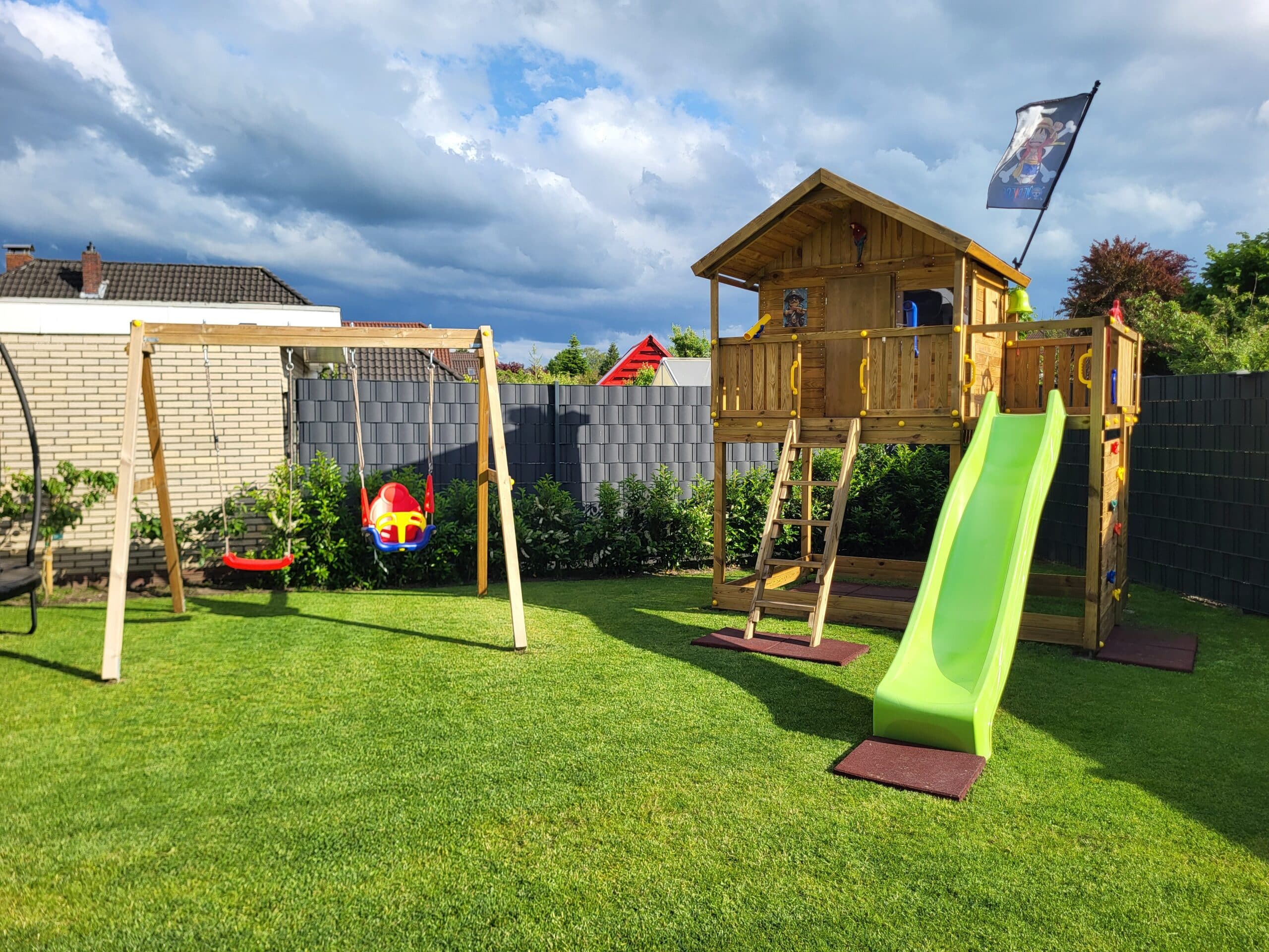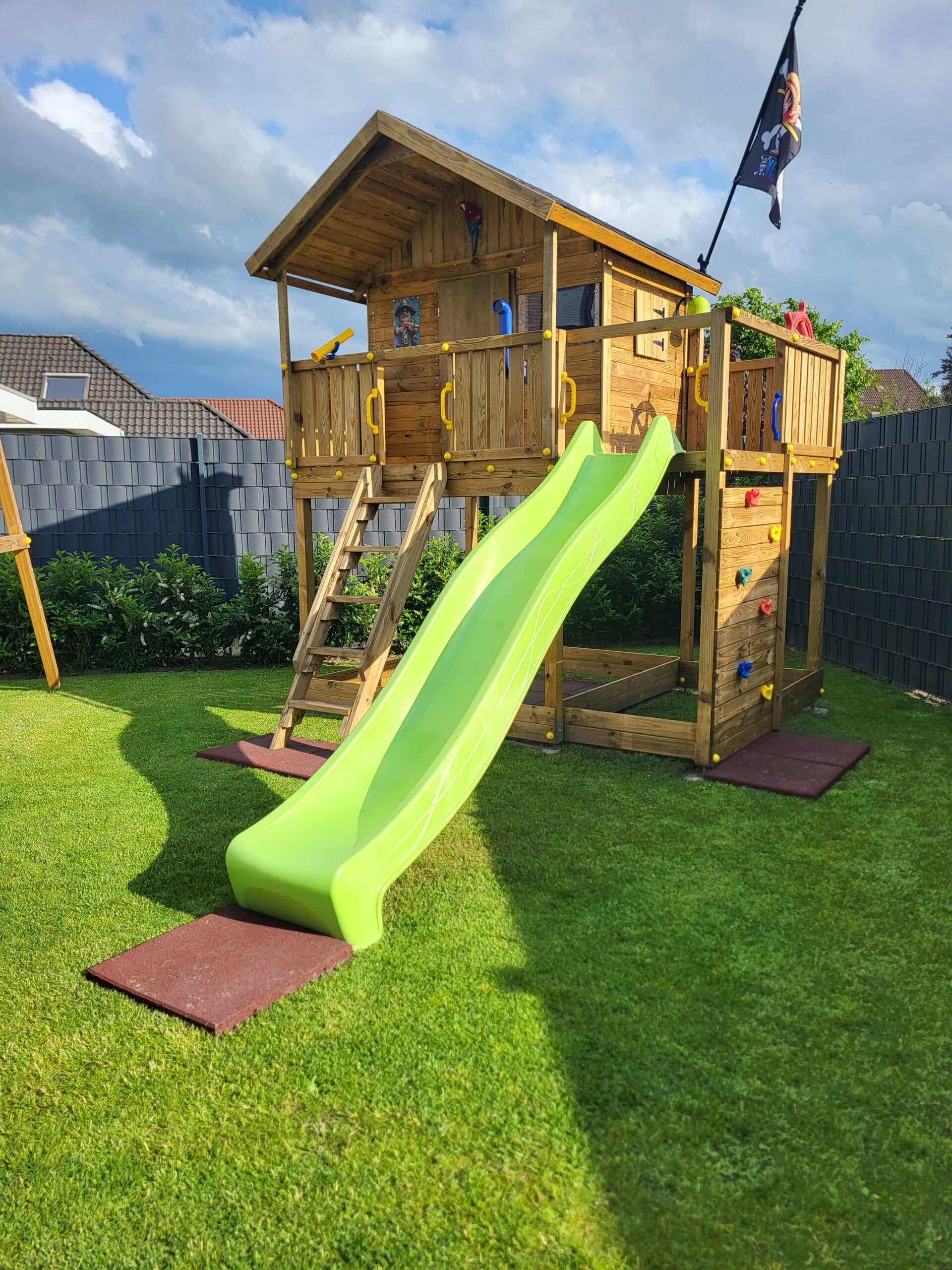 Spieltürme/Stelzenhäuser mit einer Spielhöhe von über 60 cm müssen auf einer weichen Unterlage wie Gras oder Holzspänen aufgestellt werden.