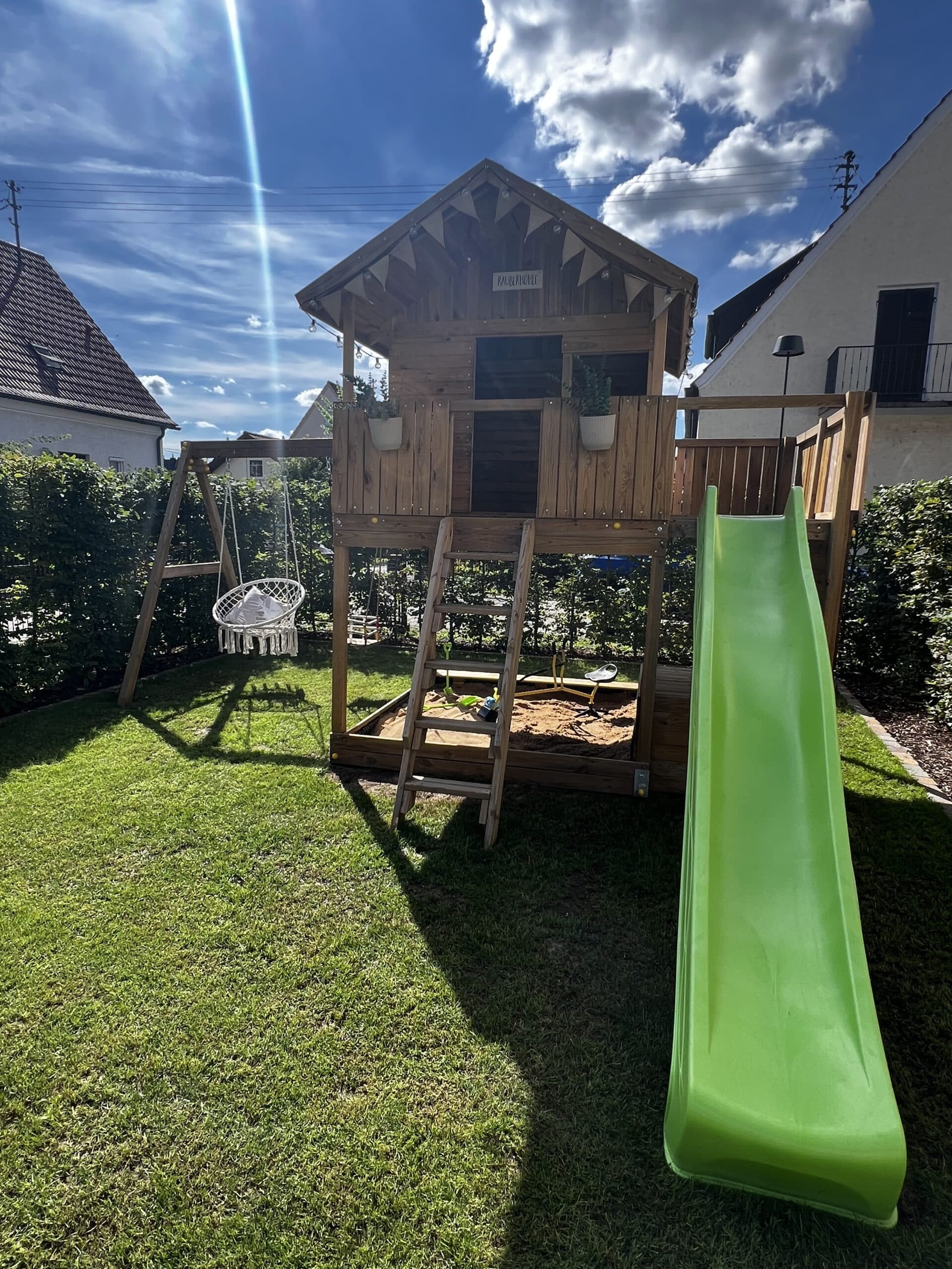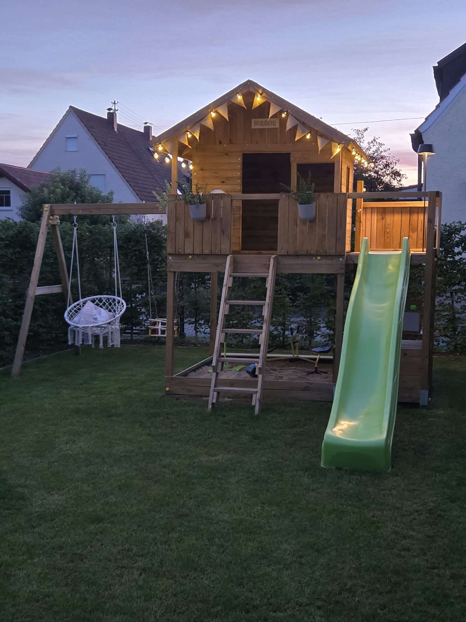 Man kann problemlos noch eine Rutsche dazukaufen und anbringen und z.B. die Schaukel, das Kletterbrett und/oder die Leiter an einigen anderen Stellen positionieren. Das sollte man sich natürlich vor Baubeginn überlegen.