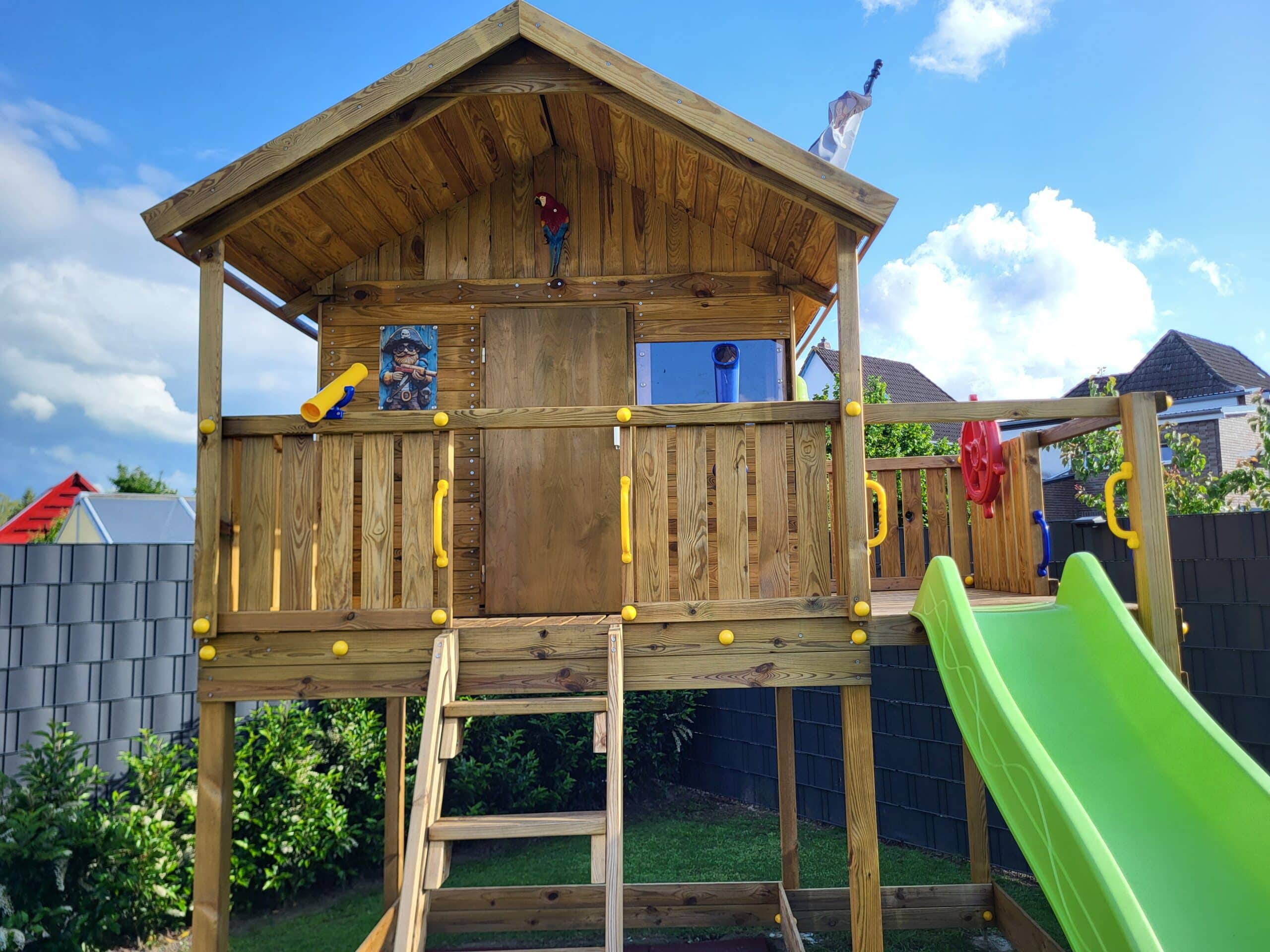Der Spielturm wird bereits inklusive einem Piraten-Lenkrad, einem Teleskop sowie einem Periskop geliefert. - VorbehandeltDie Grundkonstruktion des Spielturms ist besonders witterungsbeständig. Die massiven 7 x 7 cm starken Pfosten aus robustem Nadelholz wurden kesseldruckimprägniert. Das Spielhaus ist durch das spezielle Holzschutzverfahren der Kesseldruckimprägnierung, bei dem eine Salz-Wasserlösung (chromfrei sowie umweltfreundlich und unbedenklich) porentief in das Holz gepresst wird, vor Fäulnis und holzzerstörenden Pilzen für viele Jahre geschützt. Das Spielhaus benötigt daher keinen weiteren Schutzanstrich. Das Imprägniersalz schützt die Holzzellen und das Wasser kann danach wieder entweichen. Je nach Witterungsbedingungen kann dieser Trocknungsprozess langsam oder schnell gehen. Um das natürliche Vergrauen durch die Witterung kannst du dein Spielhaus gerne - aber erst nach vollständiger Trocknung - individuell farbig gestalten. Wir empfehlen dazu eine deckende, offenporige Holzschutzlasur. Weitere Informationen zur Kesseldruckimprägnierung findest du im "Infoblatt Kesseldruckimprägnierung" in unserem Downloadbereich.