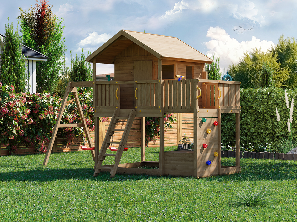 Spielturm mit Spielhaus, Doppelschaukel, Kletterwand, Toybox und Sandkasten